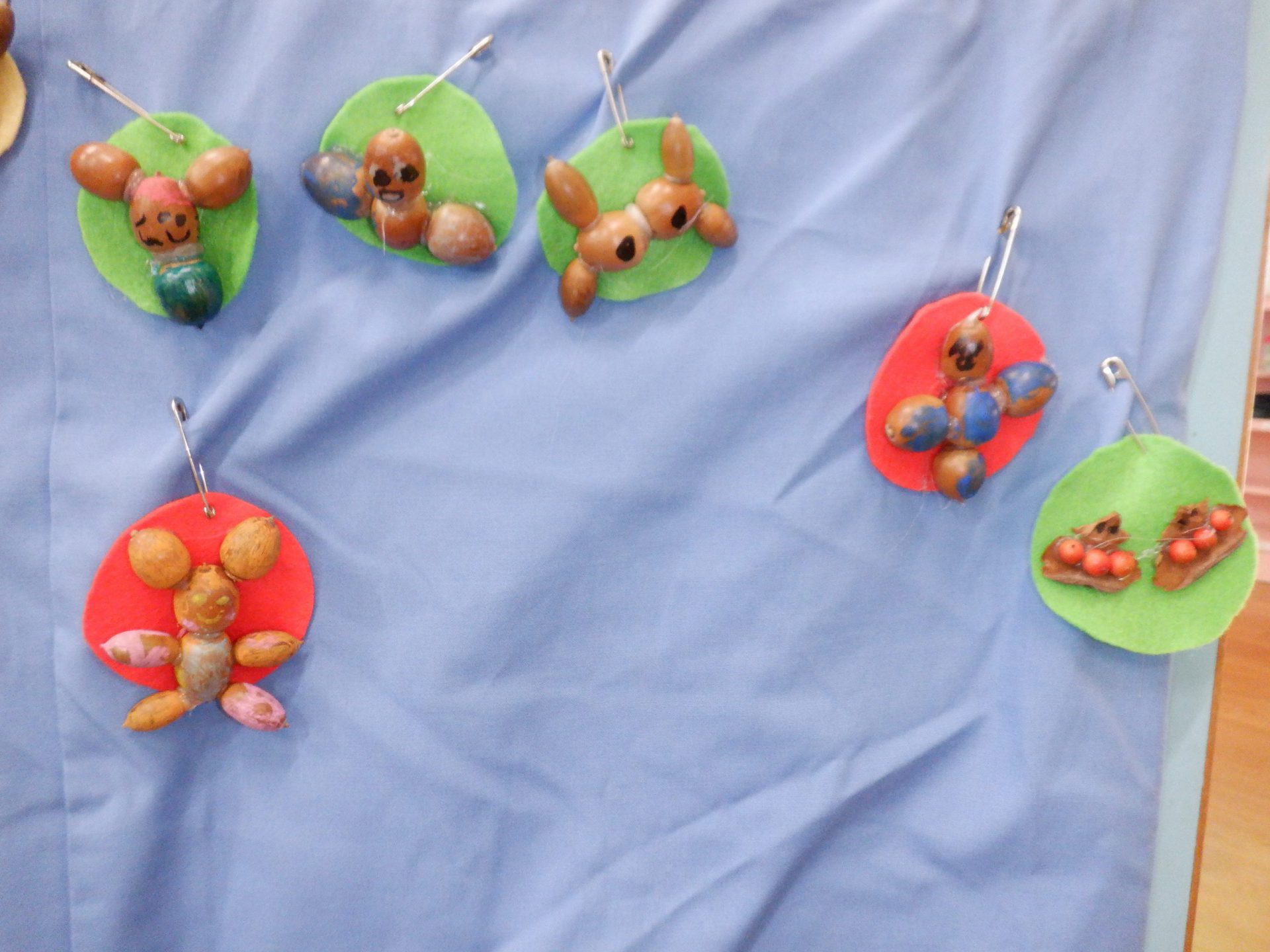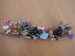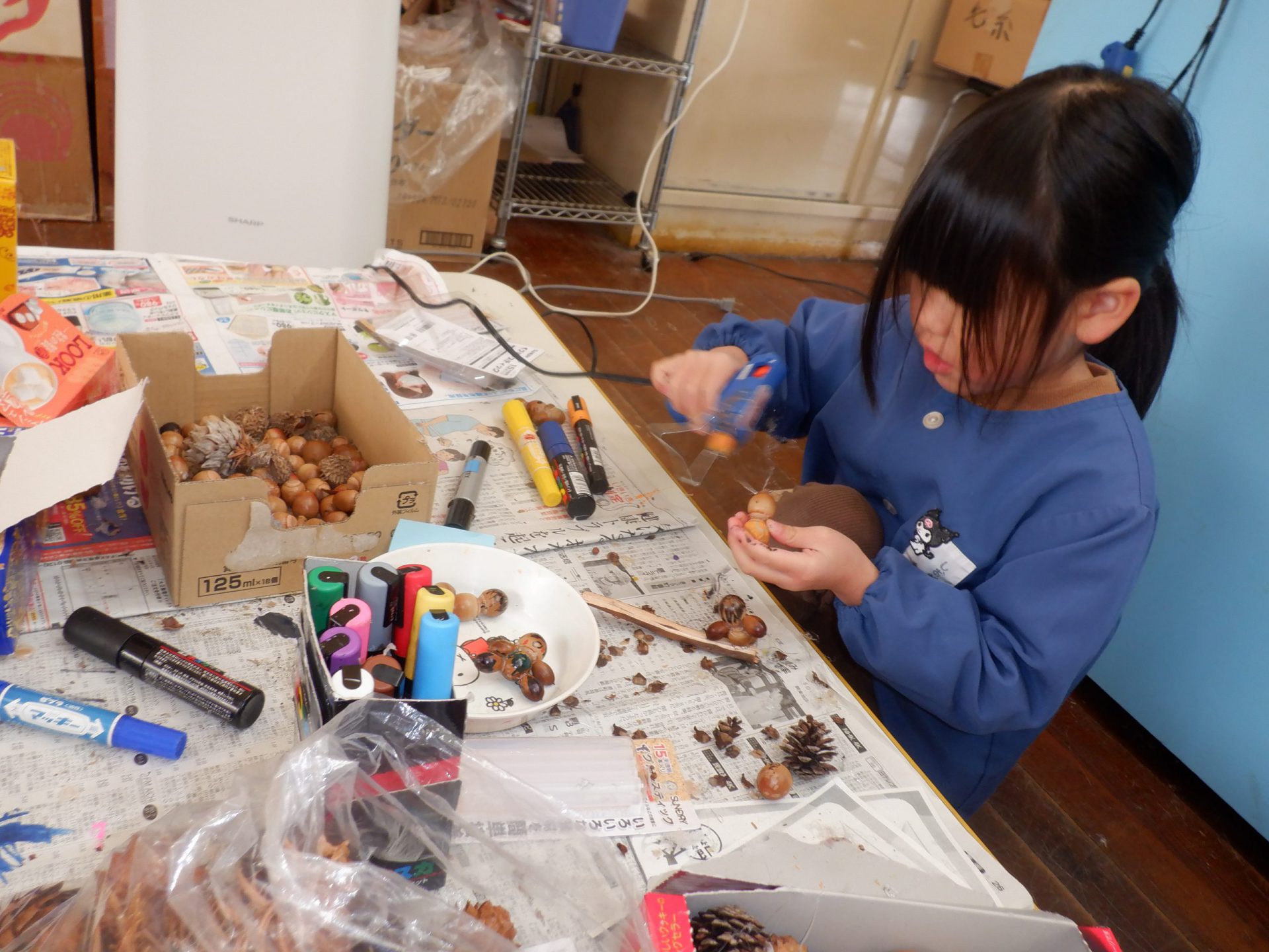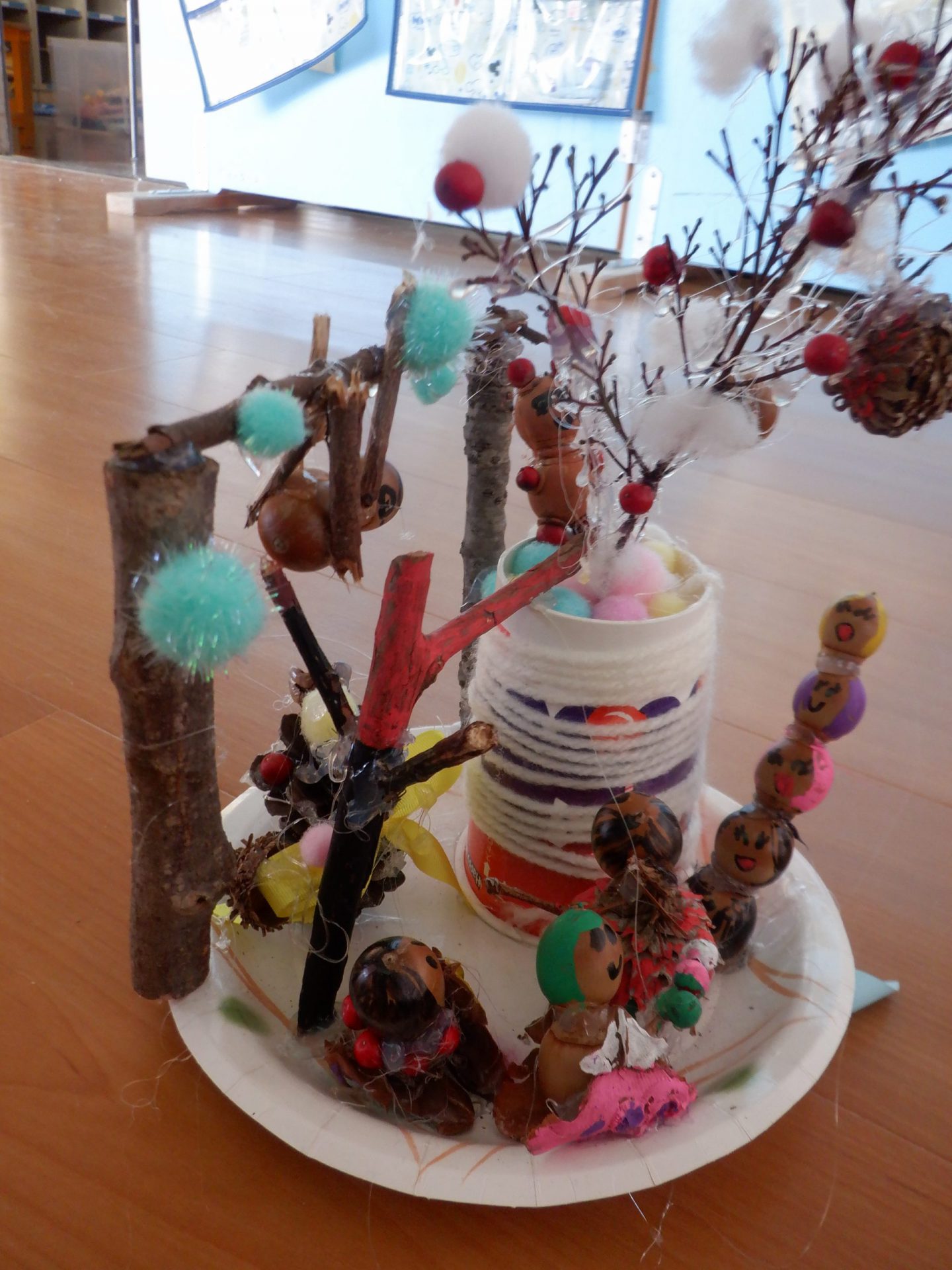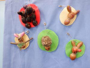 散歩で松ぼっくりやドングリ、実などを拾ってきたことから、グルーガンを使って制作が始まりました。