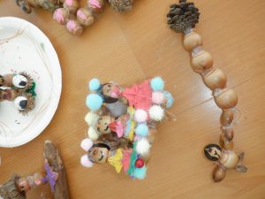 ・最初はグルーガンを使うことが楽しく、様々な自然物をくっつけて遊んでいたが、その経験が人形作りや小さい友達へのプレゼント、さらに他の素材の物とくっつけての飾り作りなど活動が広がっていった。子どもが自由に自然物や道具、素材を使い、まずは自分の思いついたままに試してみることが、その後の自然物の制作・あそびへの意欲にも繋がるのではないか。
