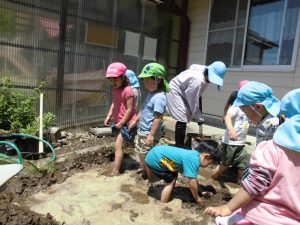 子どもたちと一緒に田植えができたらいいなと職員で話し合い、保育園の庭のかたすみに田んぼを作ることにしました。