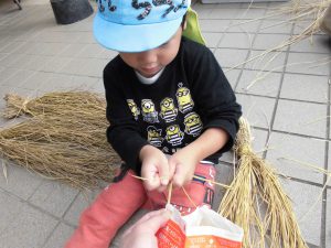 牛乳パックに穂の部分を入れて、入口を閉じて引っ張っていきます。