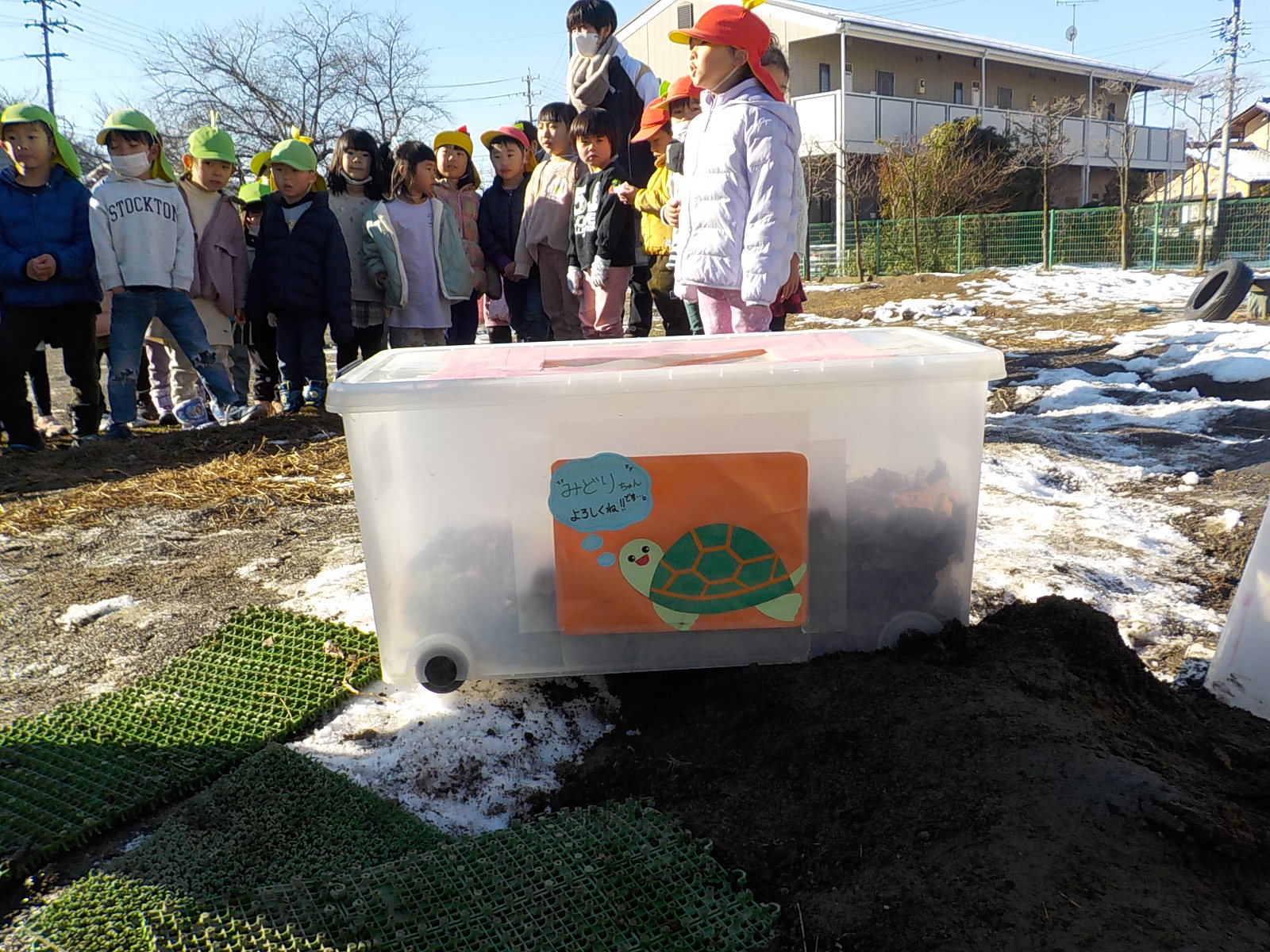 土の中に入りました。「みどりちゃん大丈夫かな?」とみどりちゃんが土の中に入って心配している子もいました。でも大丈夫。暖かい土の中でゆっくりと休んでねみどりちゃん。
