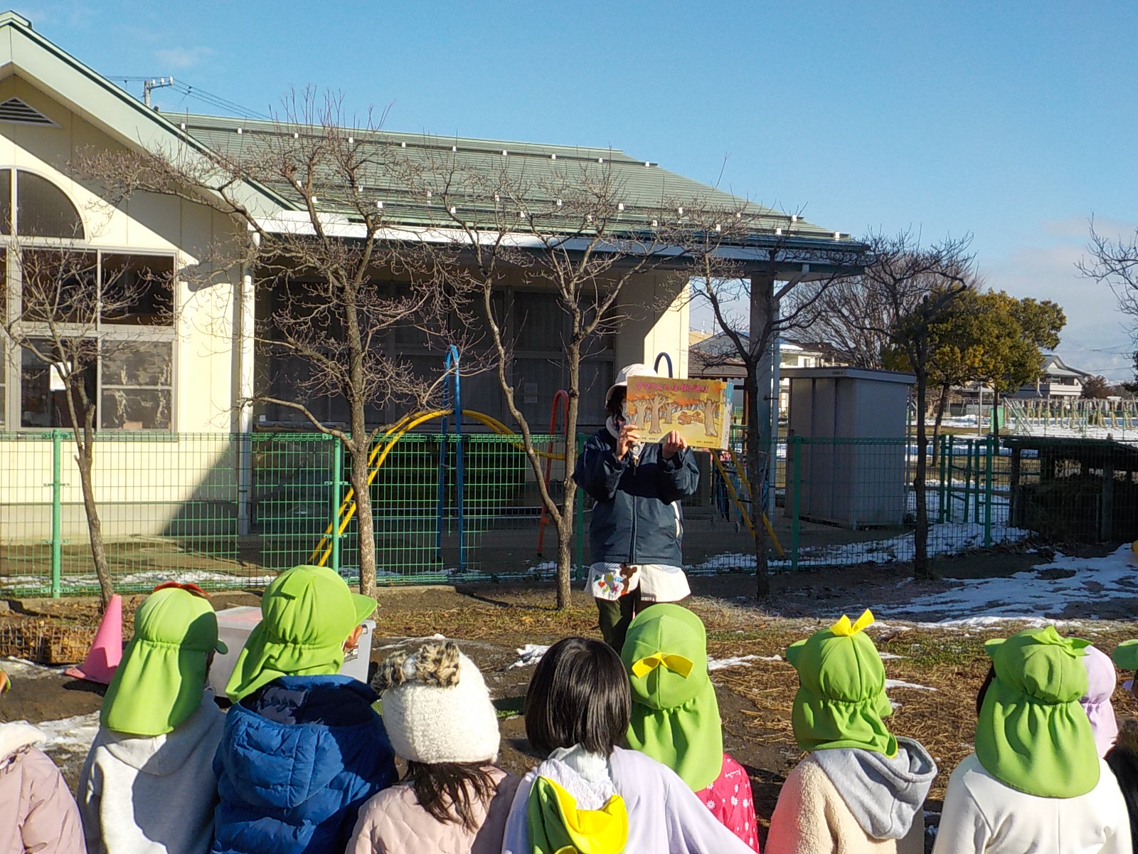 最初に保育士が「くまさんのふゆごもり」という紙芝居を読み、‘冬眠’について話をしました。