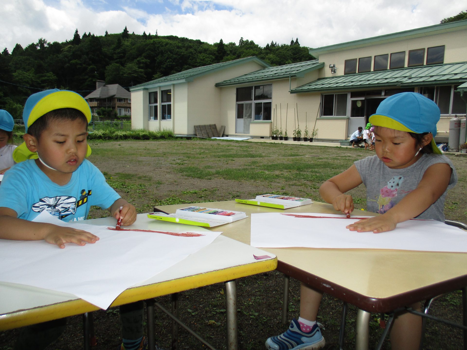 「何やってるのー?」 「お外で、お絵描きしてるんだよ」