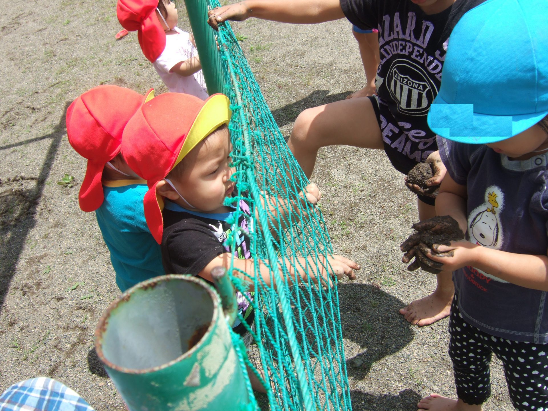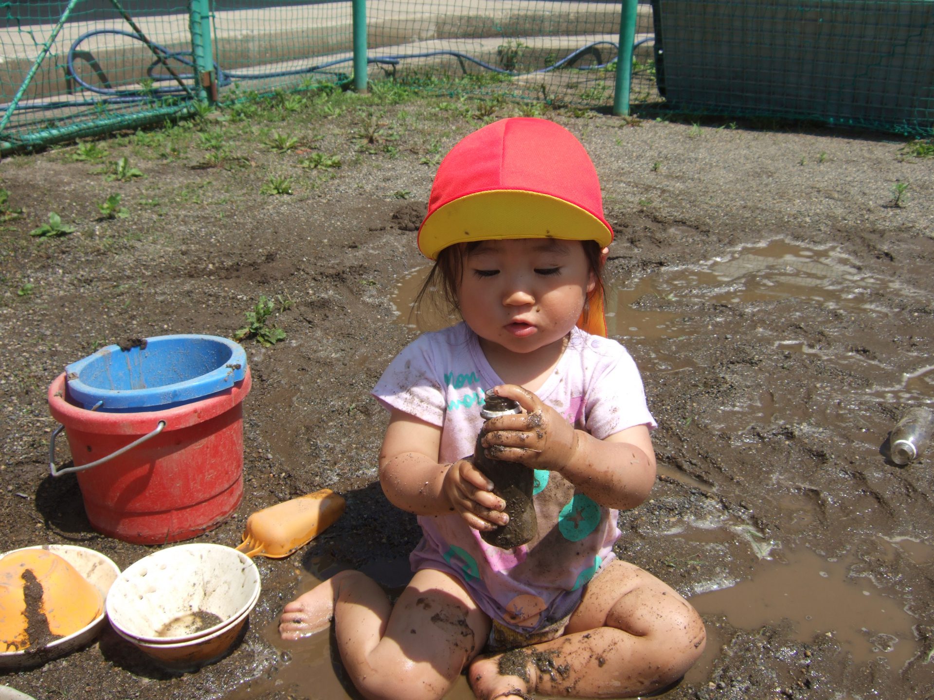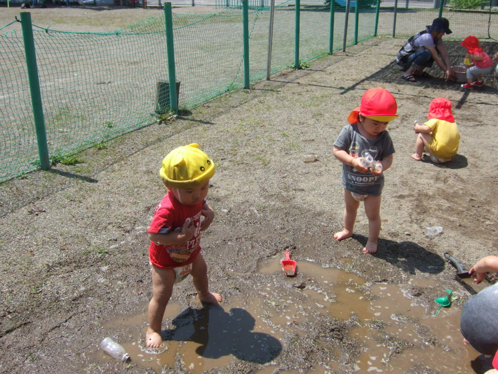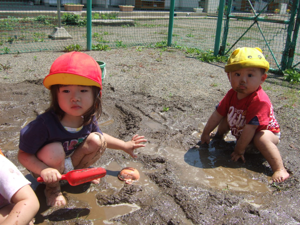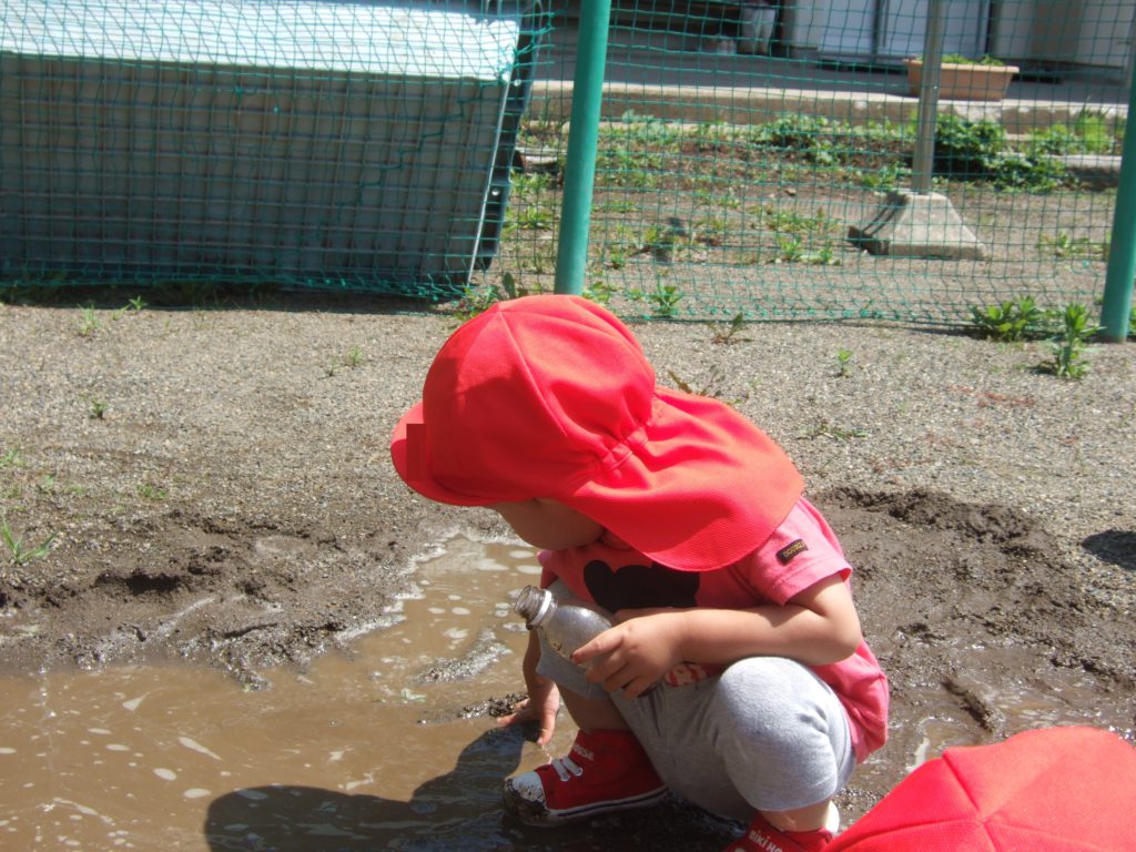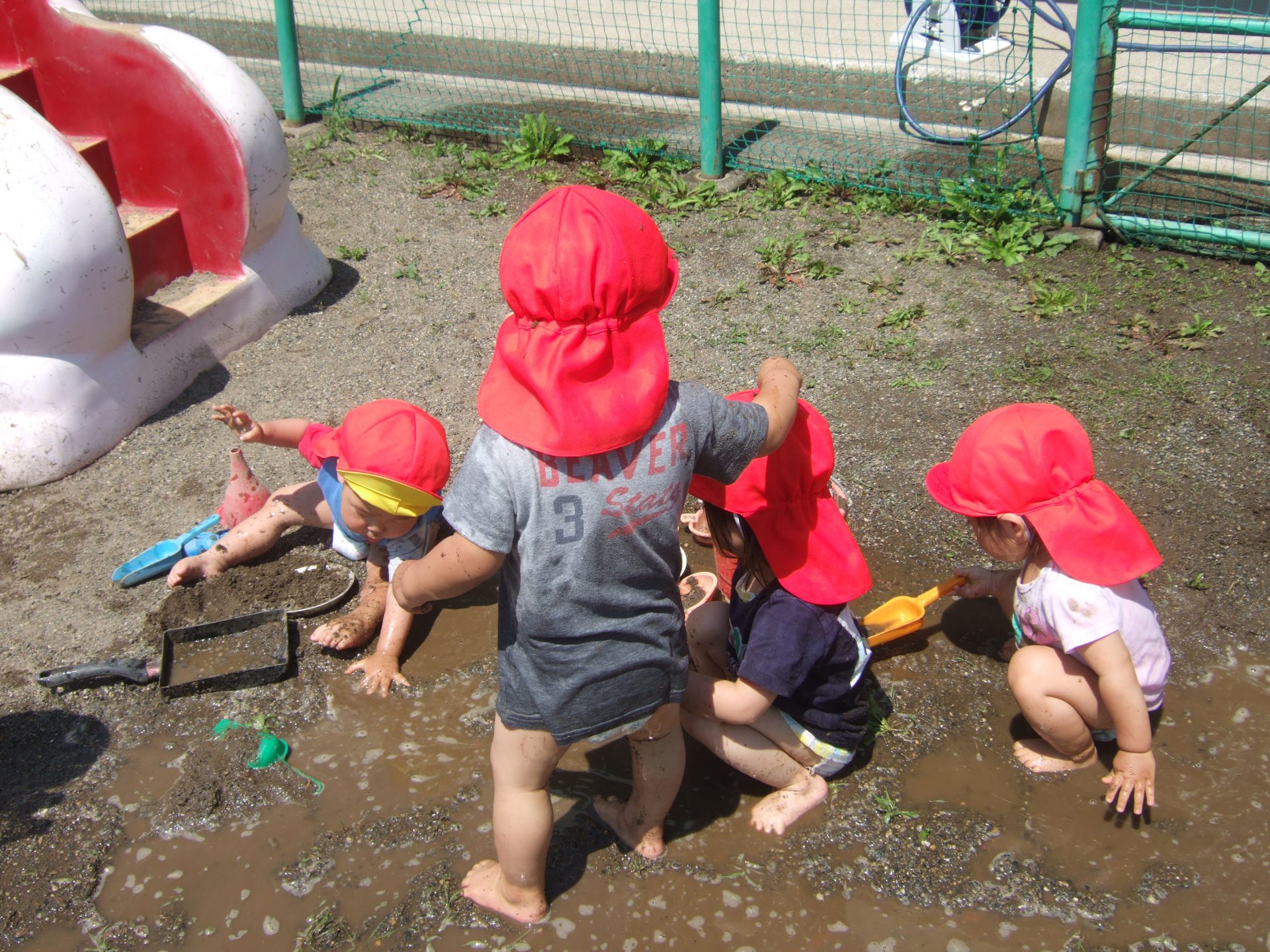 これから本格的に始まる水遊びの前段階として泥遊びを取り入れて楽しんでいます。裸足や手で泥の感触を味わって喜ぶ姿やいやいやの姿などいろいろな表情を見せてくれます。子ども達の一人ひとりの興味や関心がどこにあるのか、また探索したいやってみたい気持ちを受け止めながら危険のないよう日々過ごしていきたいです。