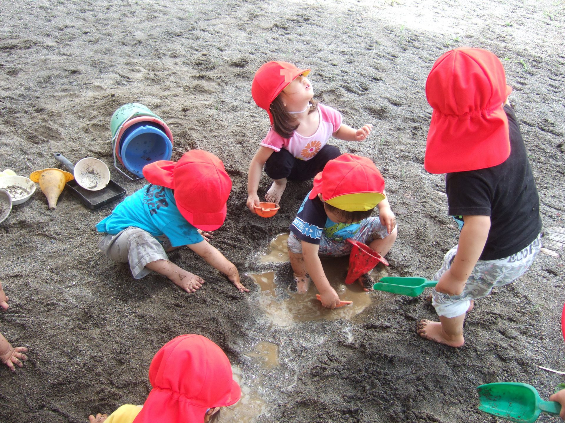 お天気や体調を見ながら戸外で砂、泥あそびを楽しんでいるあんずぐみの子ども達。
