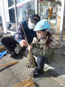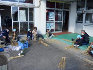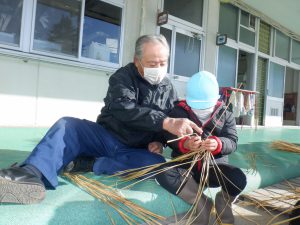 そして、杵原応援団の皆さんに教えてもらいながら藁を編んでおやすを作ります。
