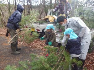 杵原応援団の皆さんが一緒に行って、松を切ってくださるので、その切った松を運ぶお手伝いをしました。