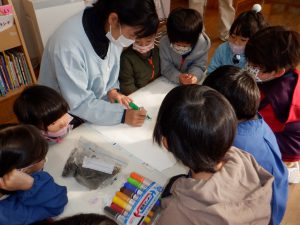 異年齢で川をめぐる散歩や市役所の建設部の方に講師をしてもらい川について学ぶ中で、年齢ごとそれぞれに興味が違うが自分なりに面白いものを見つけ発信し、友達同士共有しあう姿が見られた。