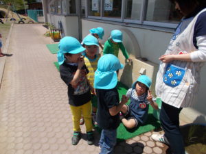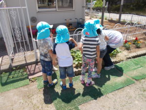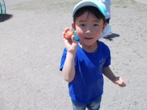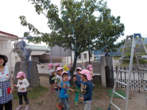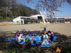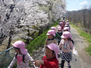 *入園して、園庭の鯉のぼりが元気に泳いでいるころ、八千穂保育園の桜も咲きました。年長児は、旧八千穂小学校へ「桜見散歩」・園庭で「お花見給食」を楽しみました。園児門の脇にある「さくらんぼの木」も徐々に咲き始めました。