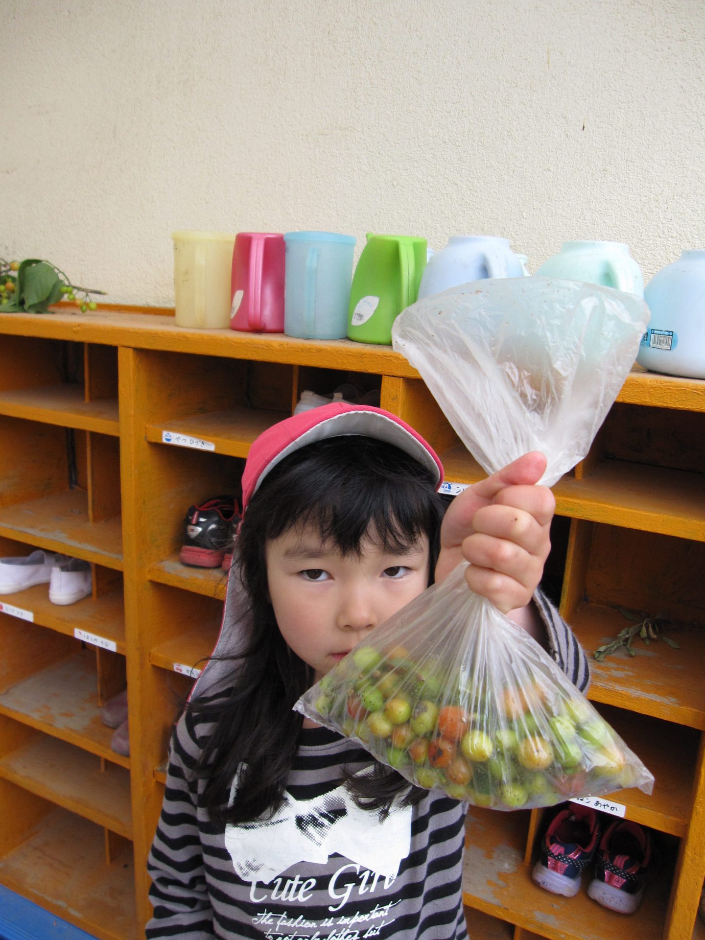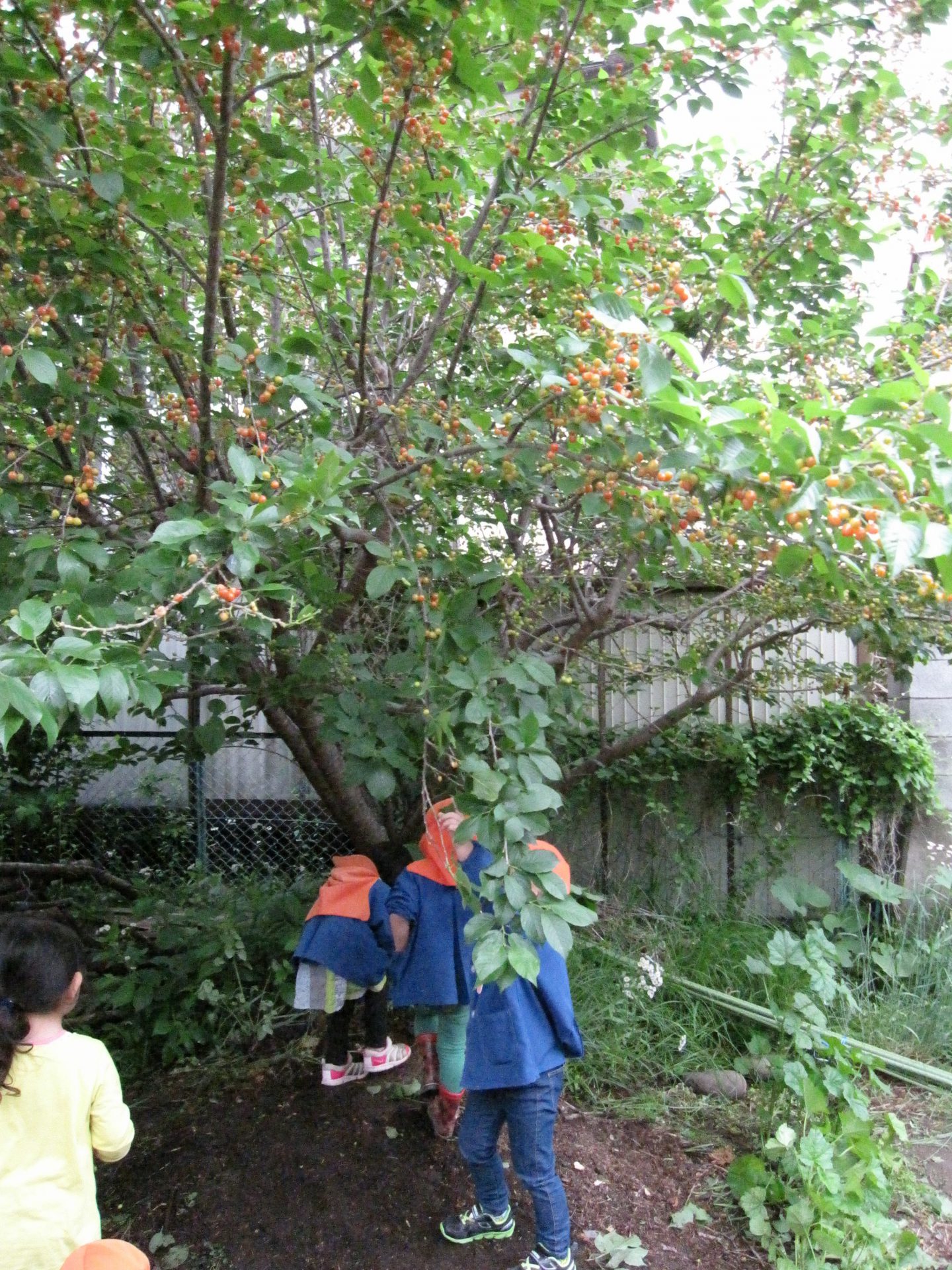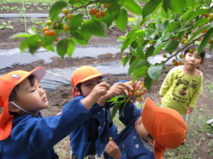 季節の恵みに子ども達はどんな反応を見せるだろう?小さなサクランボを手にした時にどんな気持ちになるんだろう?子ども達の聞き役になりながら、それぞれの子どもの思いを受け止めました。楽しく遊んだ経験がもっと遊びたいという意欲や、来年の実りを楽しみに待つ心が持てるようになってくれたらいいなと願っています。