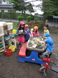 子ども達は桜の木々の中からサクランボが実る木があることに気が付きました。サクランボの木の下はたくさんの実が落ちていました。拾ったり手を伸ばして集め始めました。集めた数を競ったり、友達にプレゼントしたり、ごちそう作りに発展したり。実りがあるって嬉しい、楽しいをたくさん感じました。