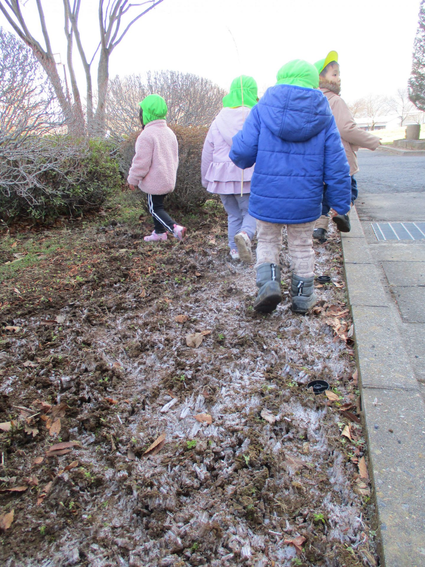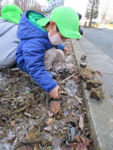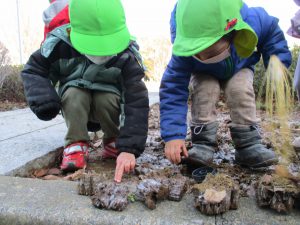 ・朝、園庭の氷を見つけ触っていたところから、氷を作ろうということになり、一人一人入れ物を見つけて水を入れ、好きな場所に置いていました。次の朝登園すると、すぐに氷ができているか見に行く姿がありました。子どもが興味をもって自らやってみようとする姿を大事にしていきたいです。