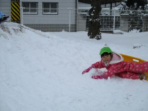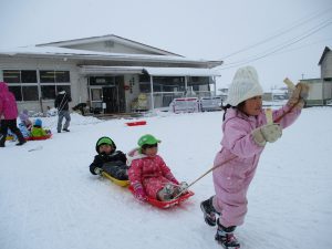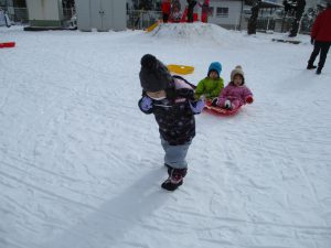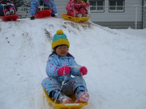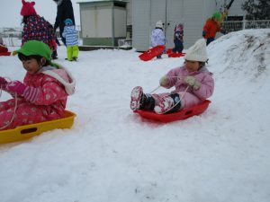 ・そり滑りでは、楽しさの中で体のバランスを取りながら滑ることを経験を通して身につけていきます。普段から体幹が鍛えられるような運動も取り入れています。
