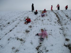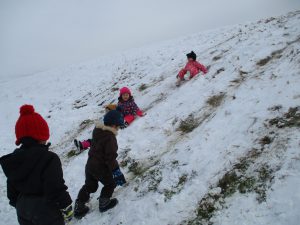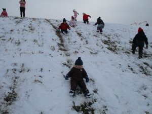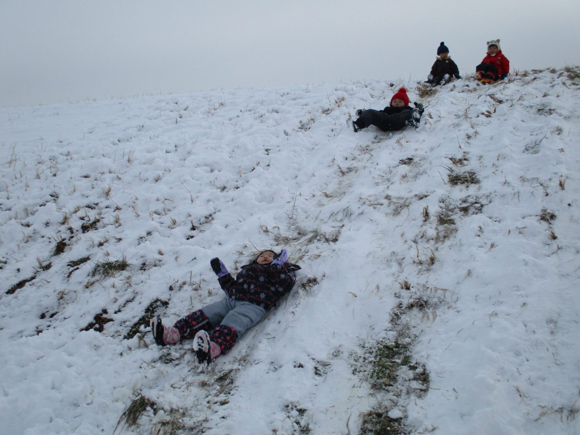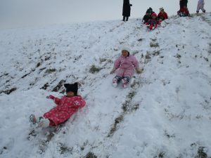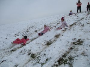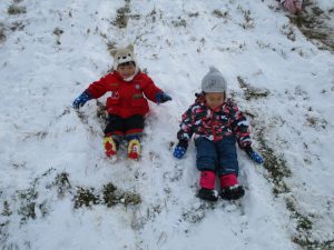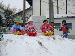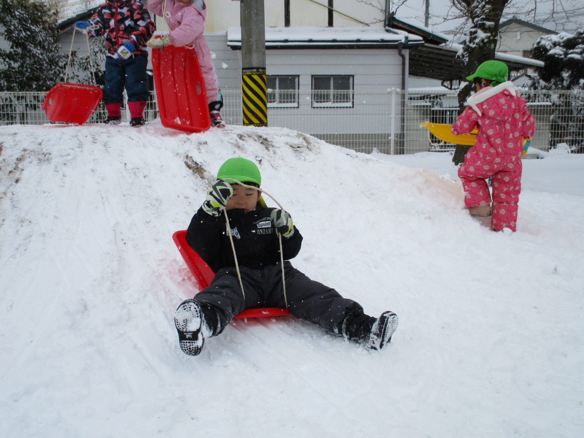・秋に土手で芝滑りを楽しんだので、土手でのおしり滑りも怖がる子がいなく楽しんでいました。着ているウエアーによってなのか、よく滑る子と、なかなか滑らない子がいましたが、手で地面を押して進んだり背中を地面につけて滑ってみたり、子どもたちが自分で試しながら遊ぶ姿がありました。保育士が先回りしてしまわず、子どもが自分で考えたり試したりする姿を見守っていきたいです。