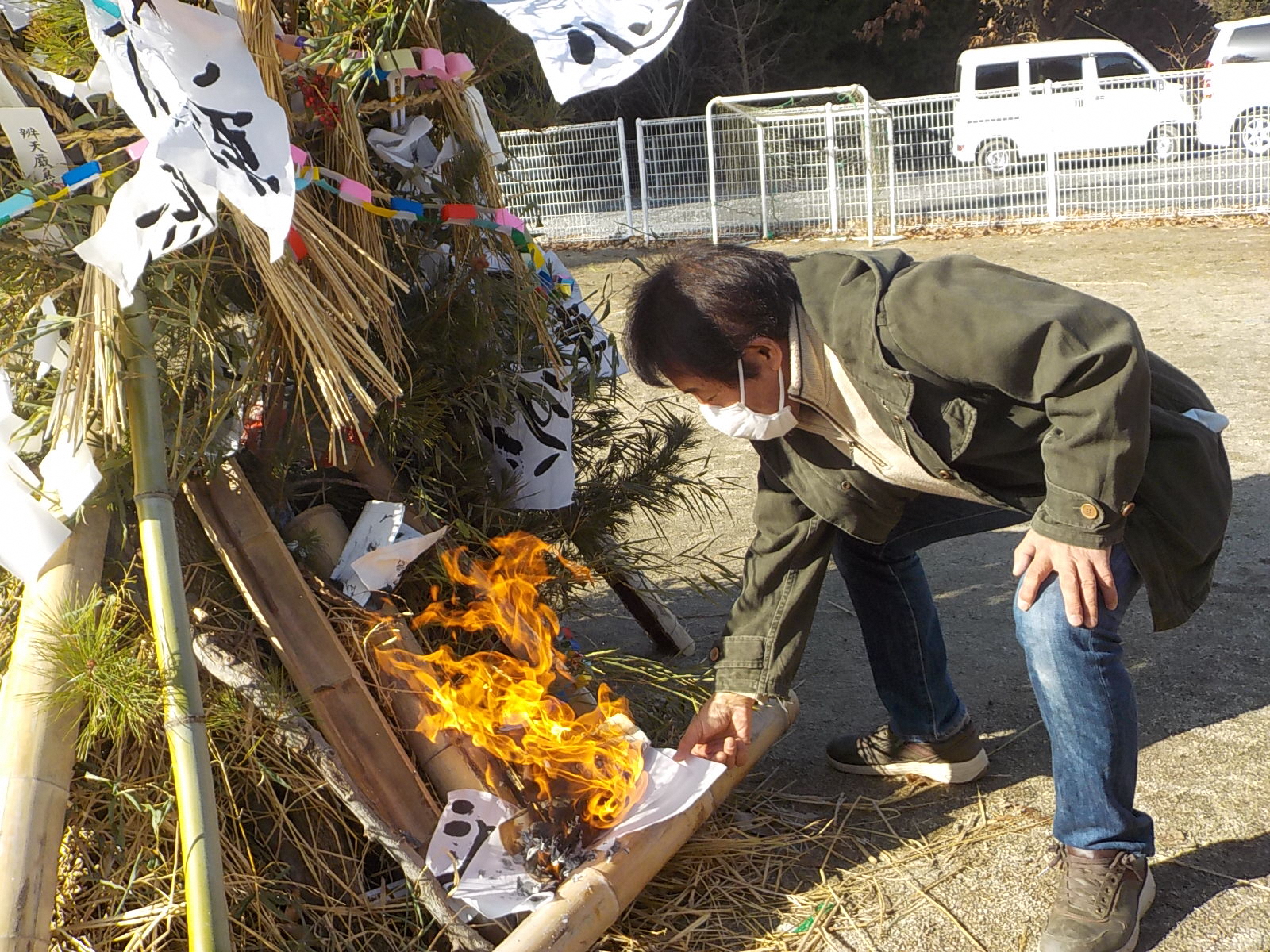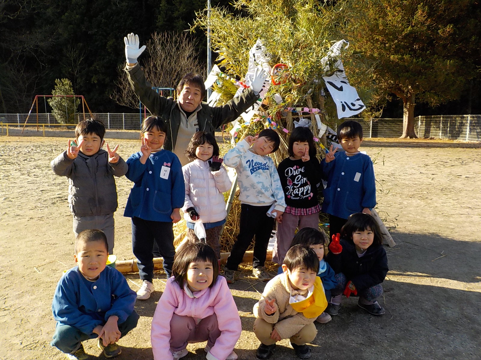 おうちからお正月飾りや松飾り、習字を持ち寄り、みんなで作ったわつなぎを飾り、立派なおんべができました。 さあ、どんど焼きが始まるよ!