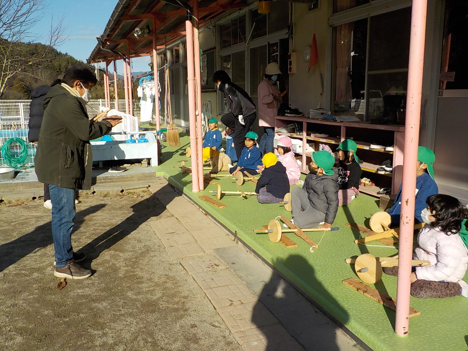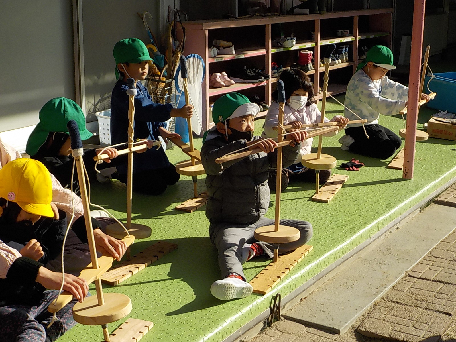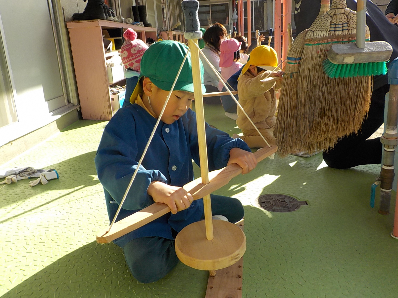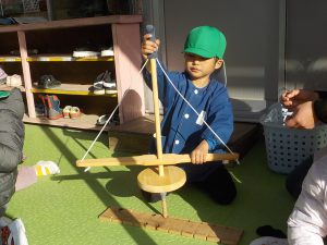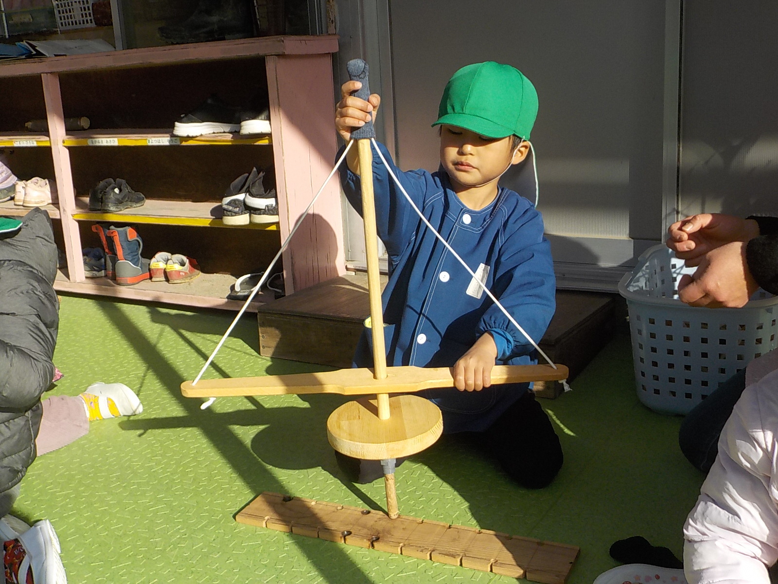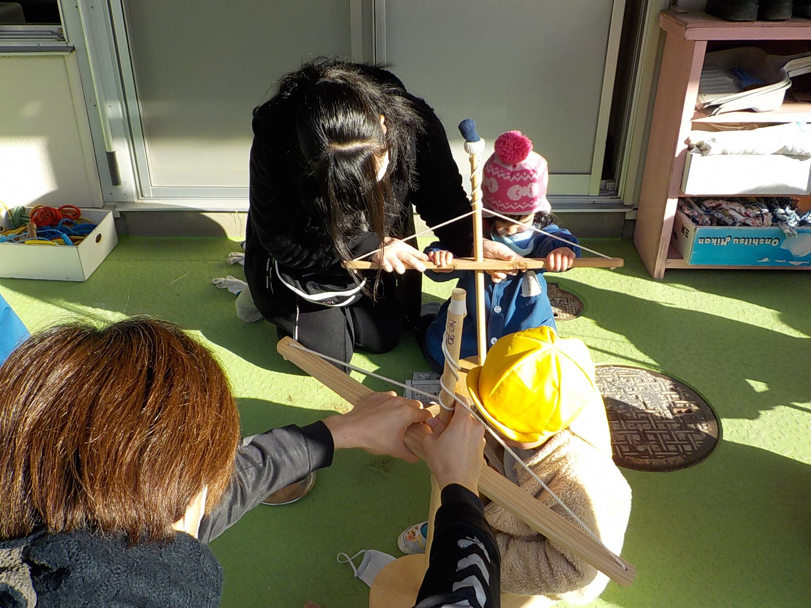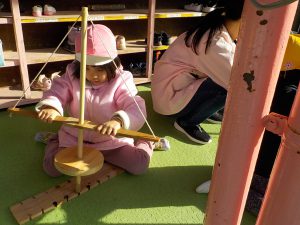 年少、年中の子どもたちは大苦戦。主事さんや保育士と一緒に動かします。