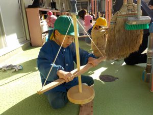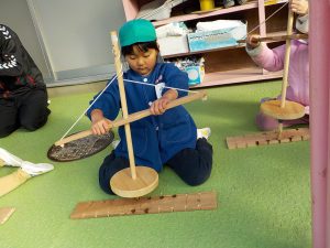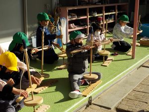 年長特別保育で火おこし体験をした年長の子どもたちは、すぐにコツをつかんでリズム良く回転させていきます。