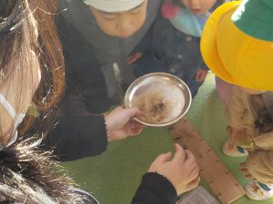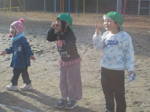 ・お正月の伝統行事であるどんど焼きの意味を知りながら、子ども達は準備から張り切っていました。火おこしは、普段ではできない貴重な体験でした。道具の使い方に苦労しながらも集中して取り組んでいました。火種を作る大変さを感じたと思います。