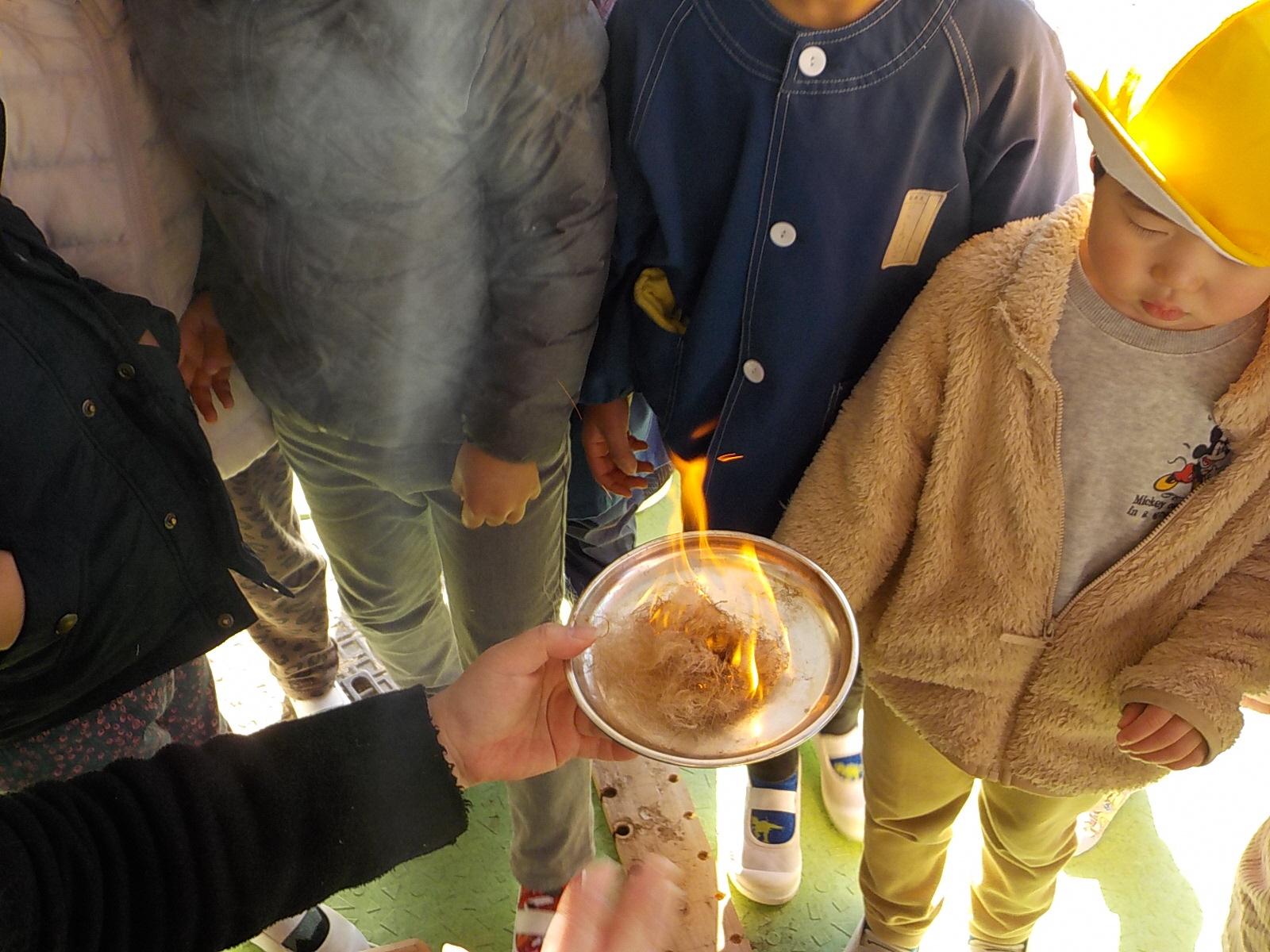 「火の赤ちゃんが出来たよ。みんなでフ~ってして。」主事さんが麻を裂いたものに移してくれた火種に息を吹きかけます。力いっぱい吹きかけて火が消えそうに・・・。そこから子どもたちは優しく息を吹きかけます。