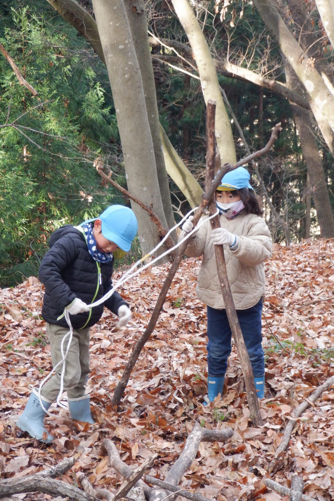 いす作り。「どうやって縛ればいいかな?」「あとはここを縛って完成だ!」