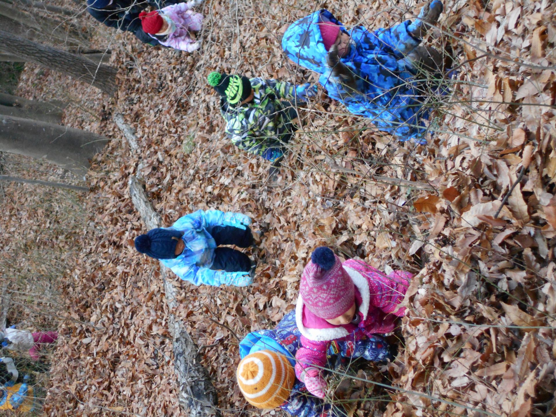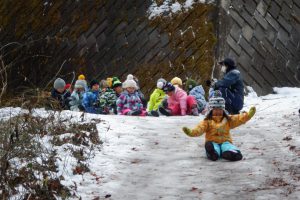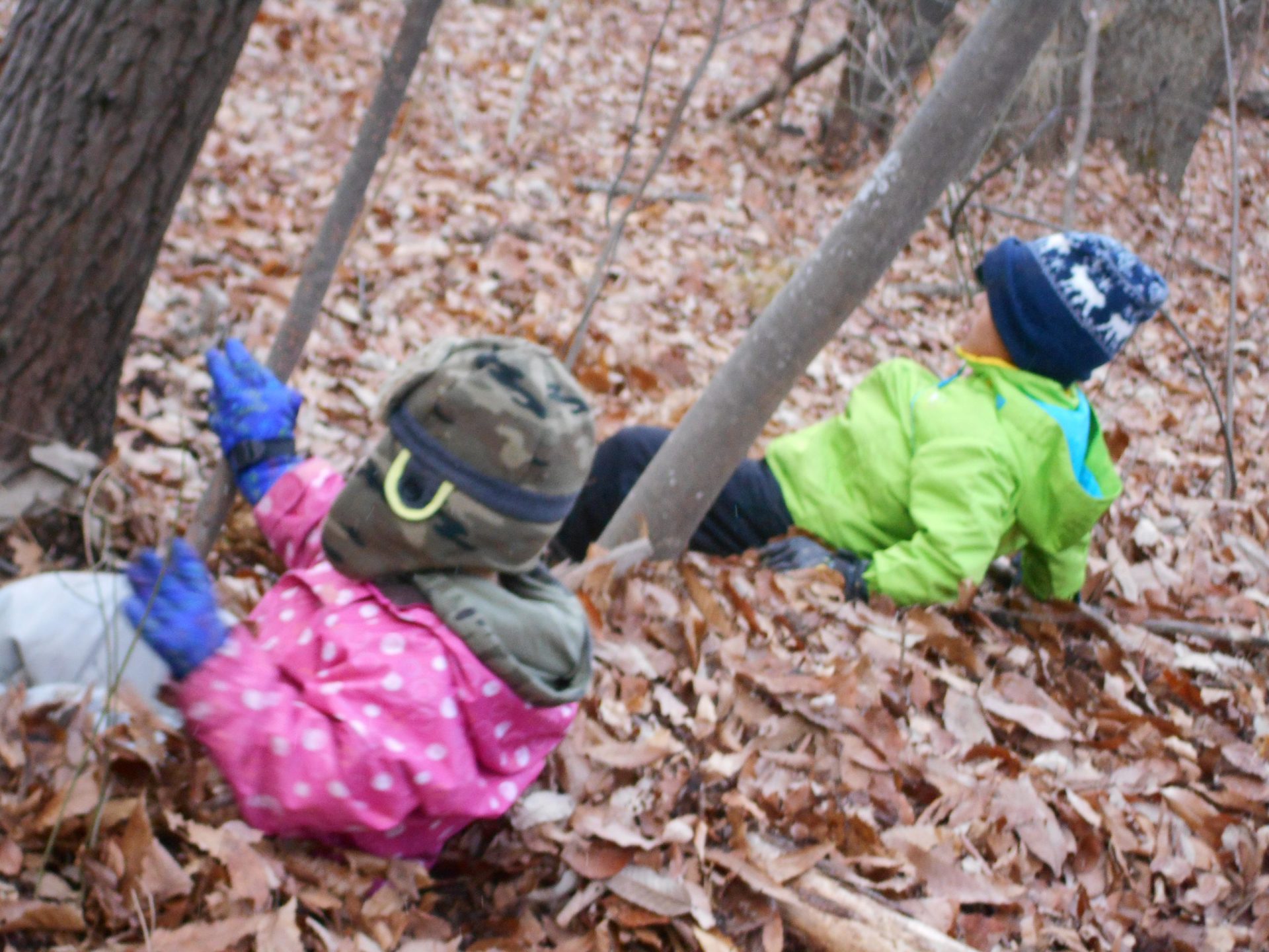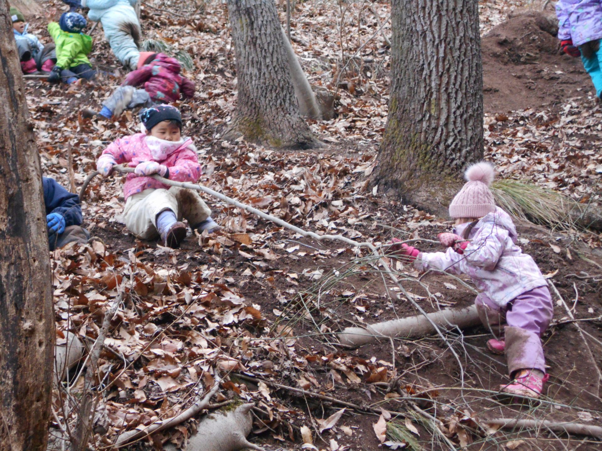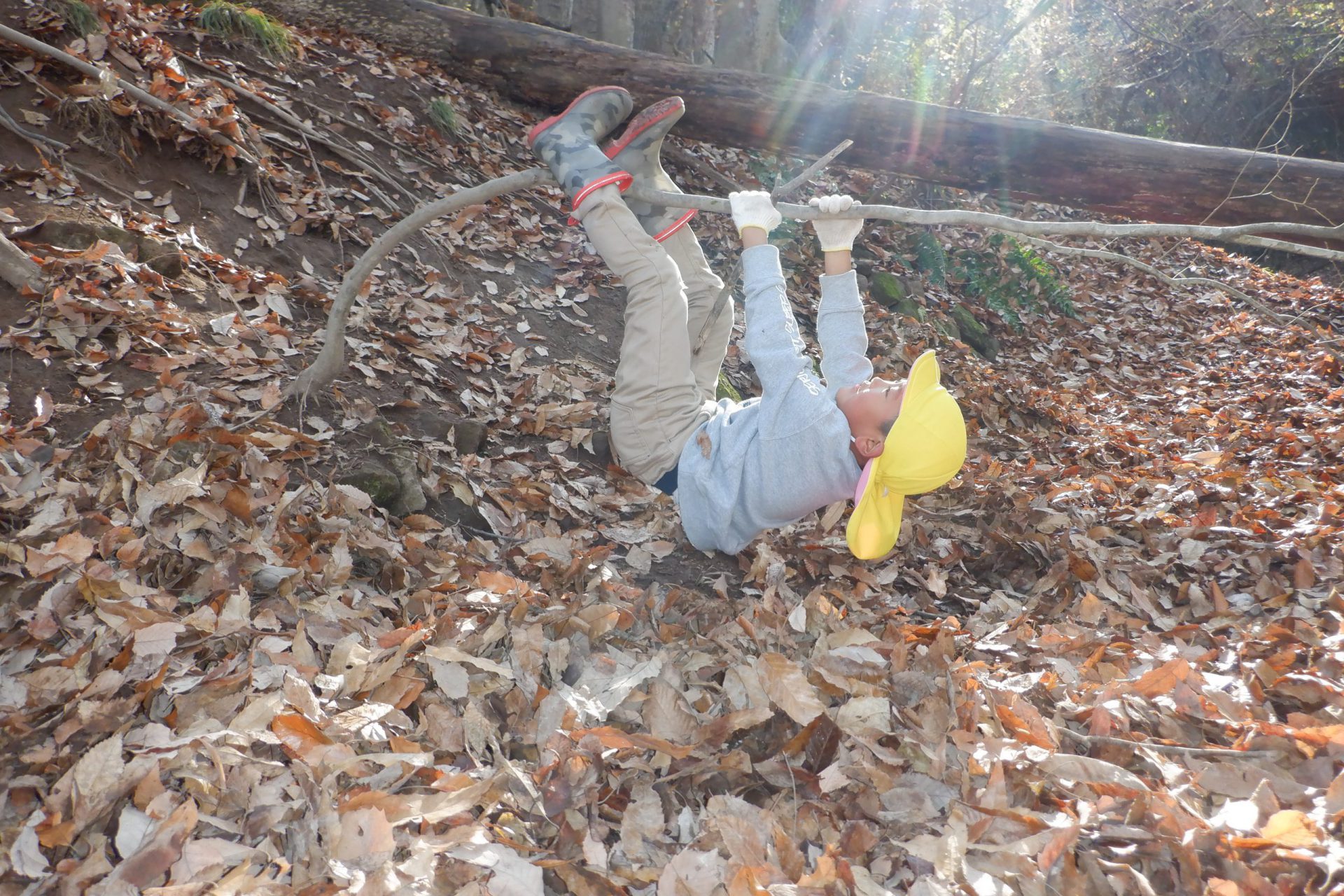 雪が無い日もフィールドで遊びます。落ち葉の滑り台や、斜面のぼりを3歳児も一緒に楽しんだよ!「つかまって!」としなる枝を倒して年下の子が登れるように助けてあげる姿も自然と見られるようになりました。