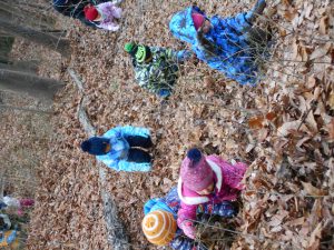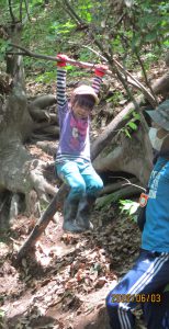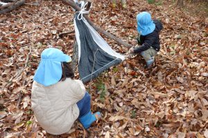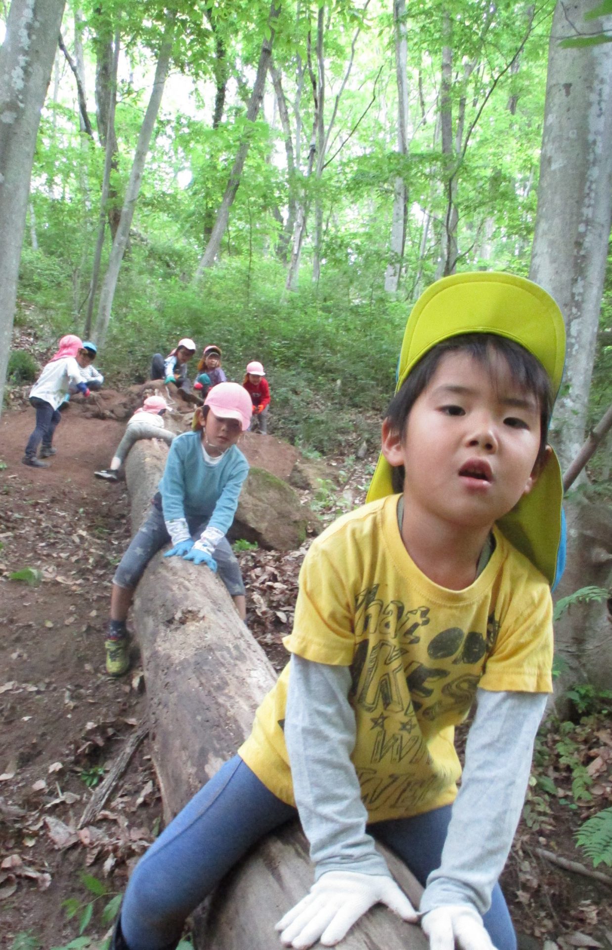 最初は初めての山の中でどう遊んだらいいのか分からず不安だった年中児も、年長児の遊ぶ姿や、友達の楽しむ姿を見てどんどん積極的に遊ぶようになりました。