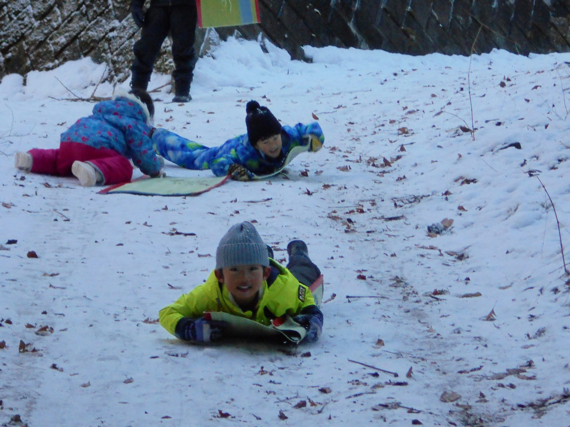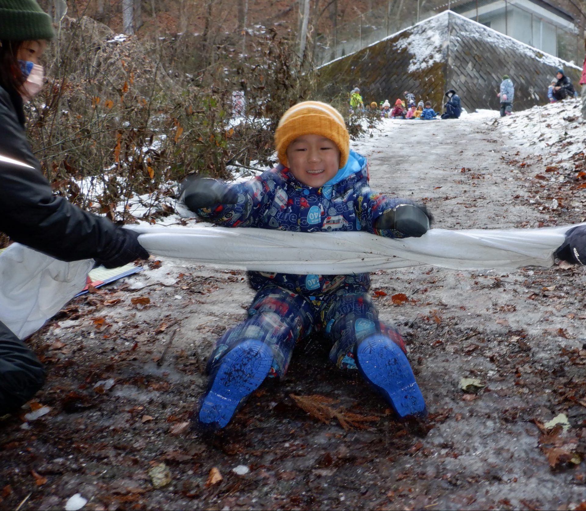 雪が降ったら斜面をござで滑ったり、スピードが出る時は布のゴールが登場。ペンギン滑りも楽しいよ!