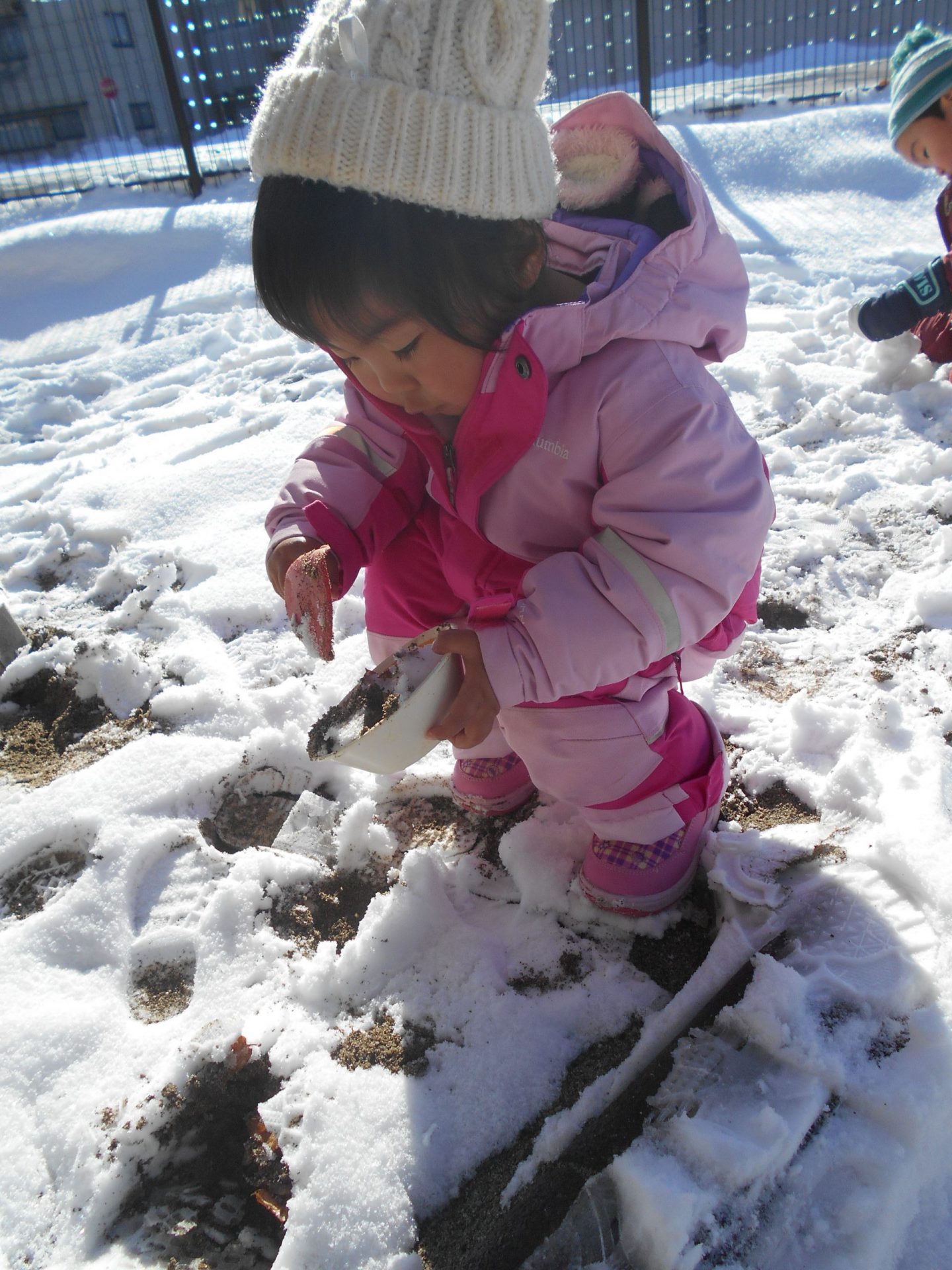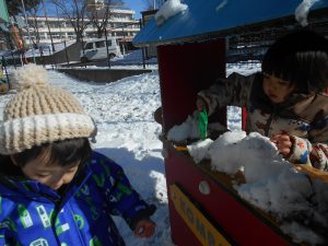 台に、アイスに見立てた雪を乗せて遊んでいました。