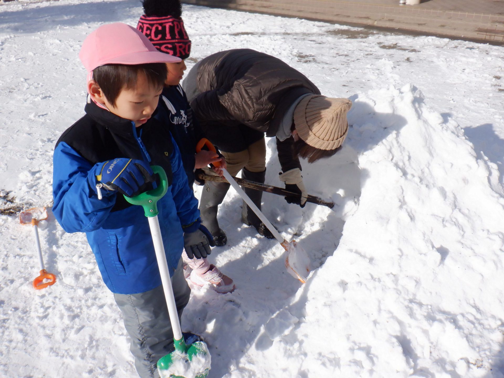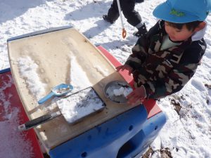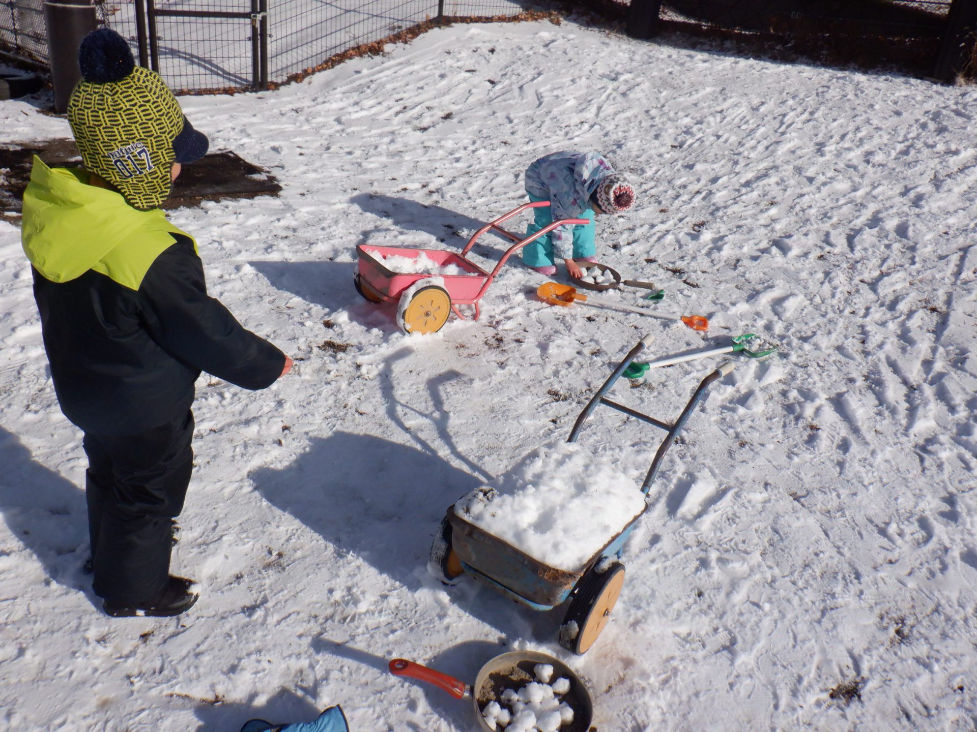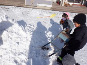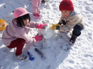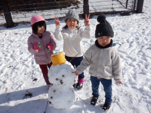雪が降った日は園庭で様々な雪遊びが始まります。