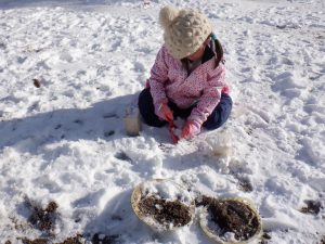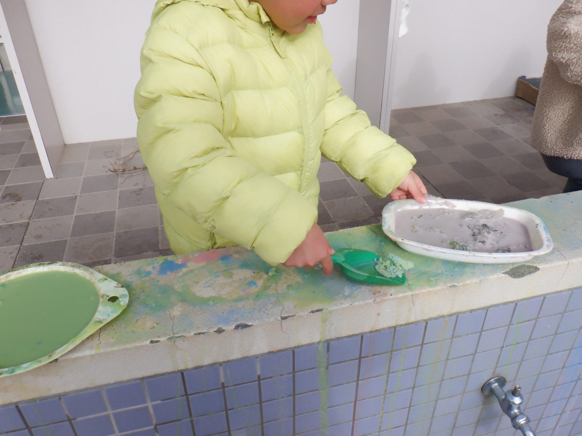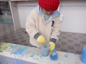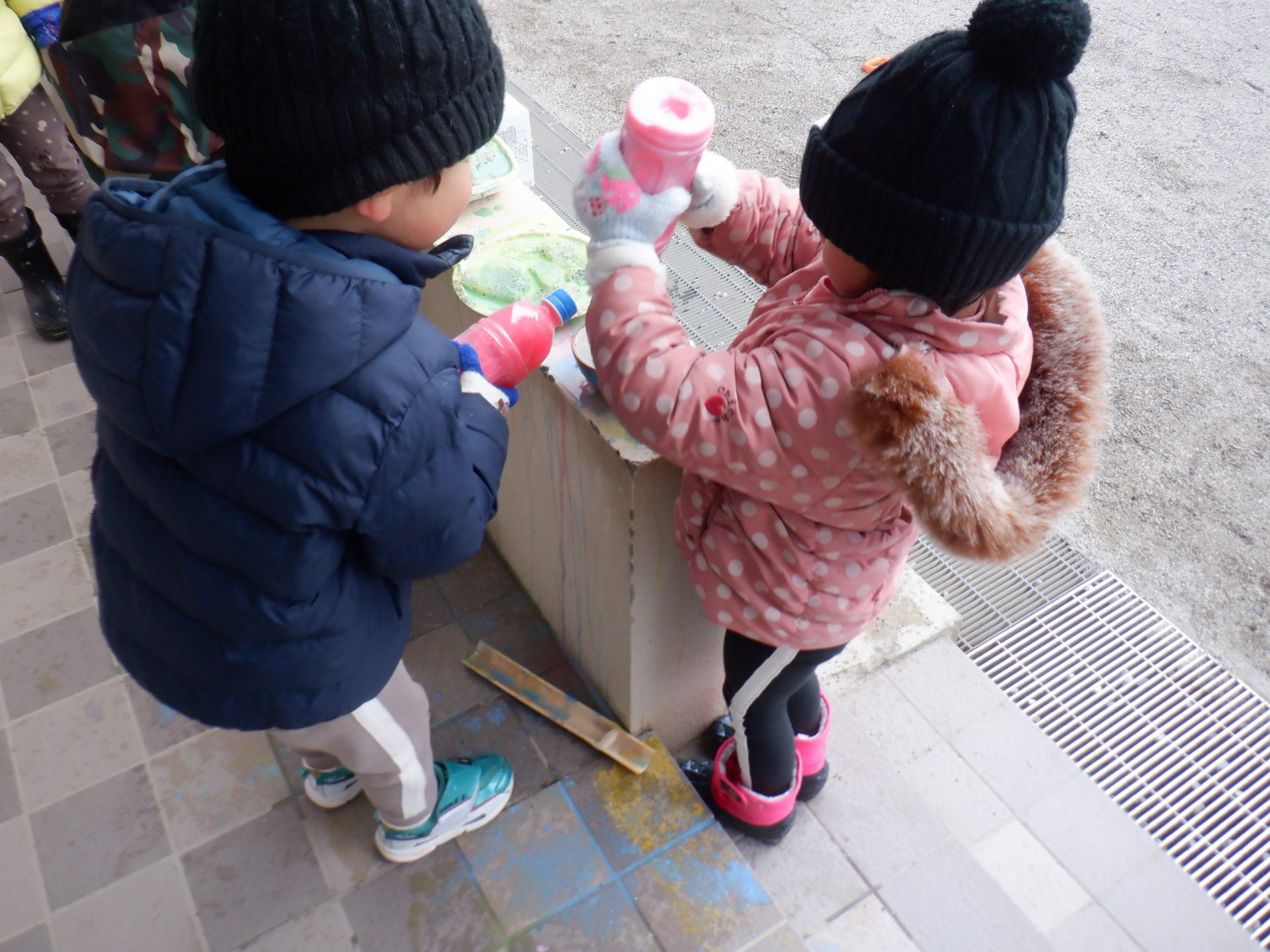 雪に色がつくのが楽しくて仕方ない年少児。