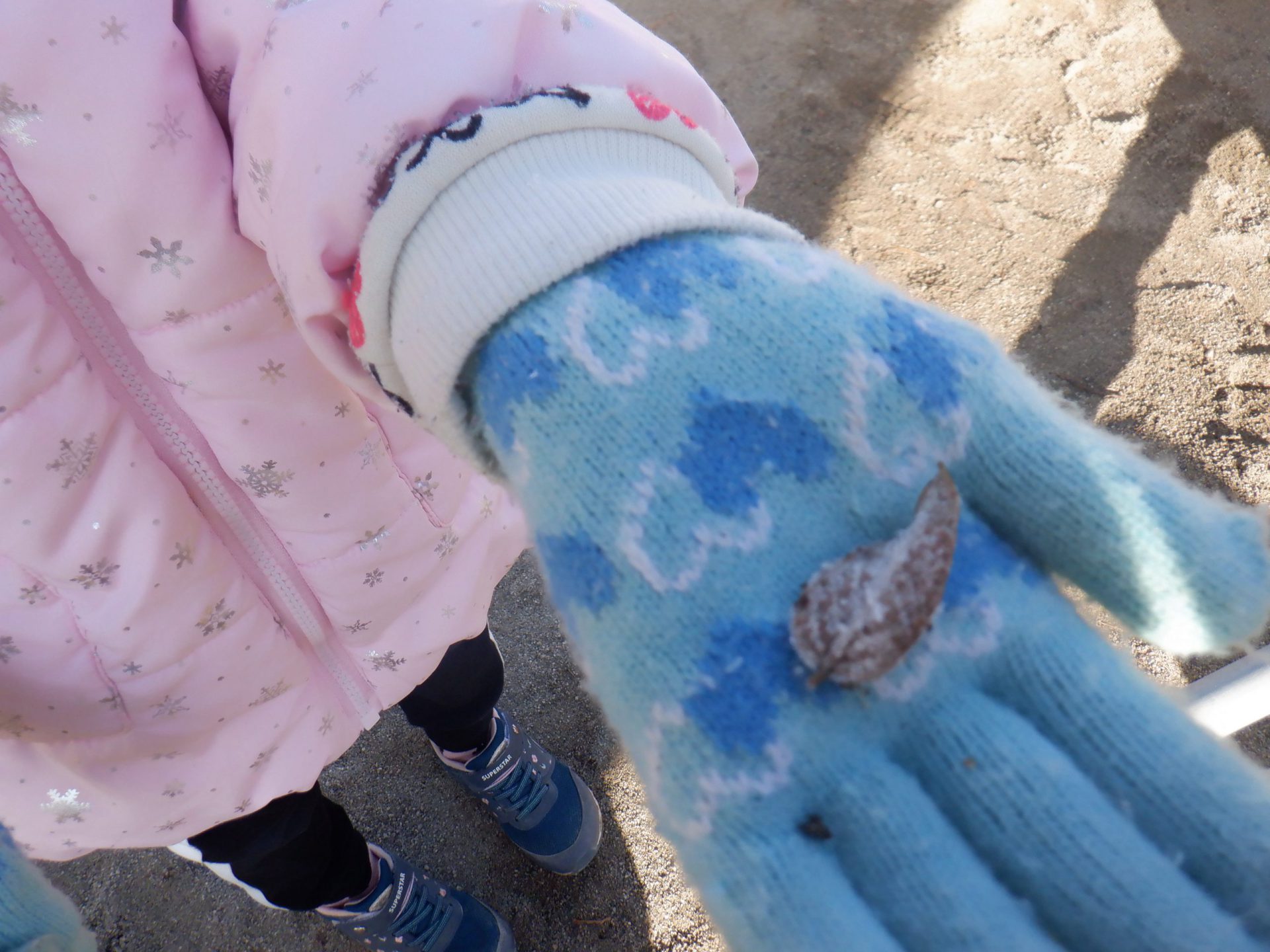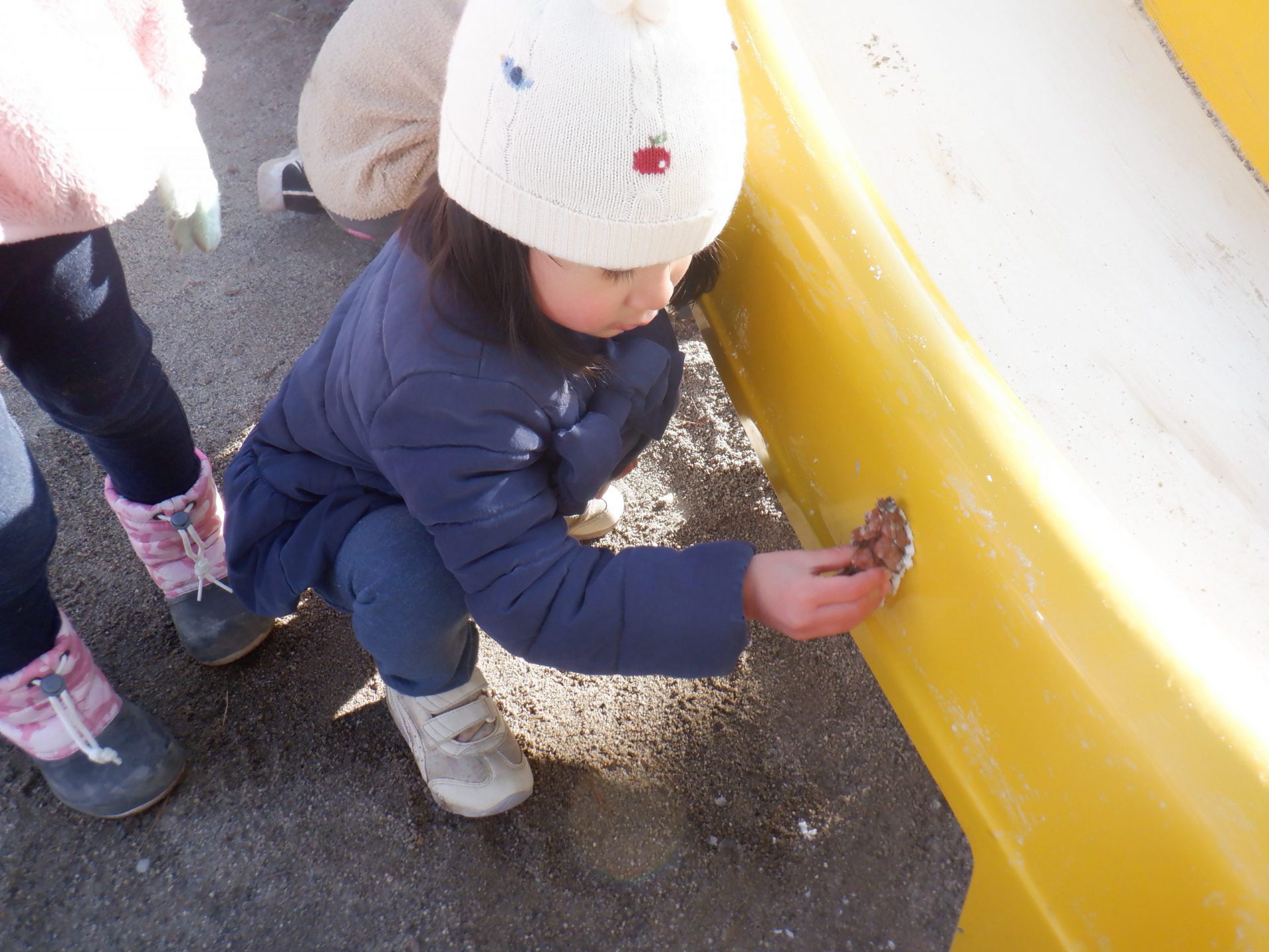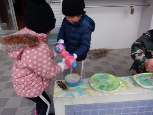 寒い日が続き園庭に落ちているドングリや松ぼっくりに霜がつき、見つけては楽しんでいます。