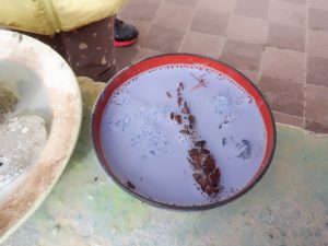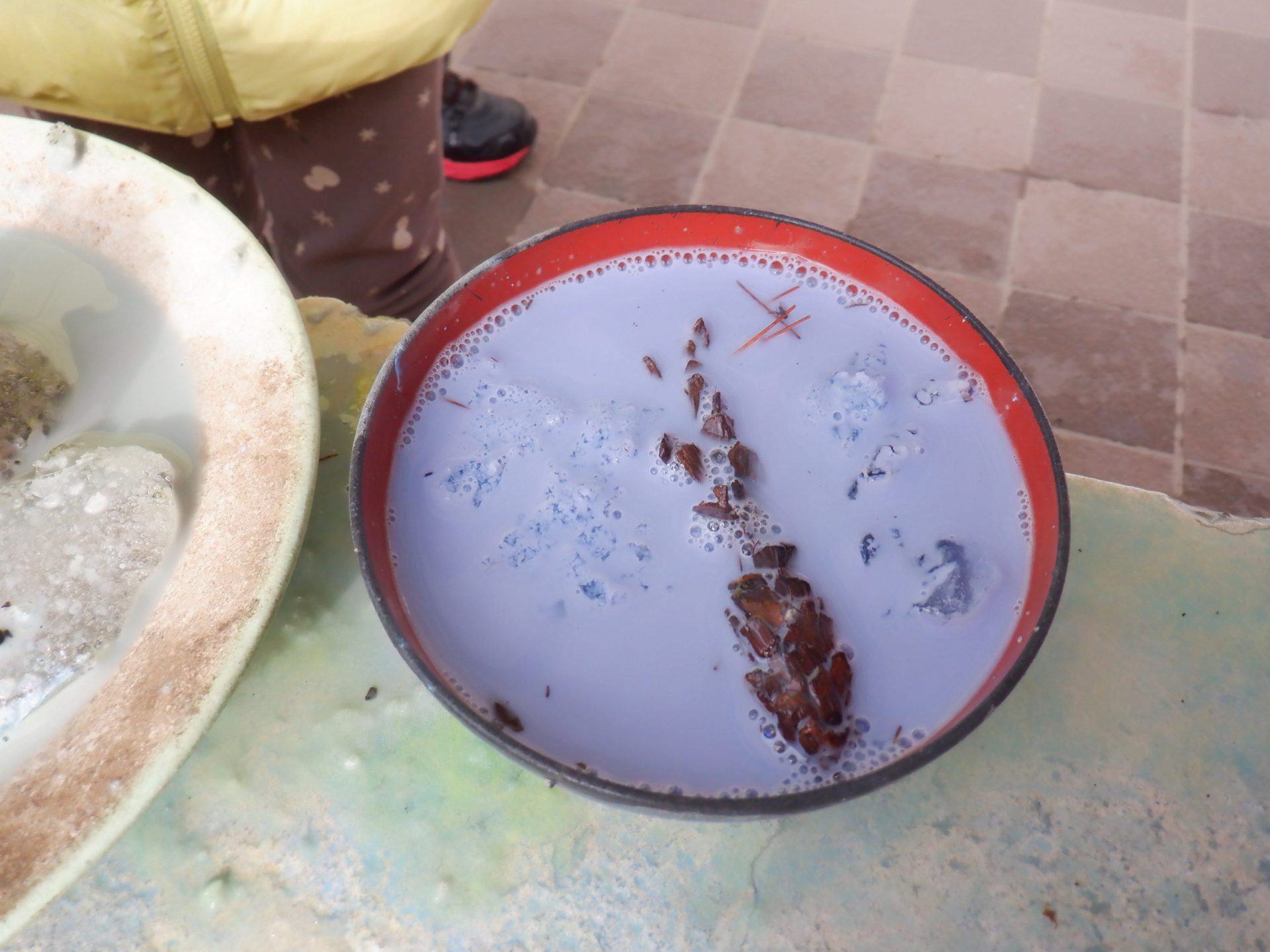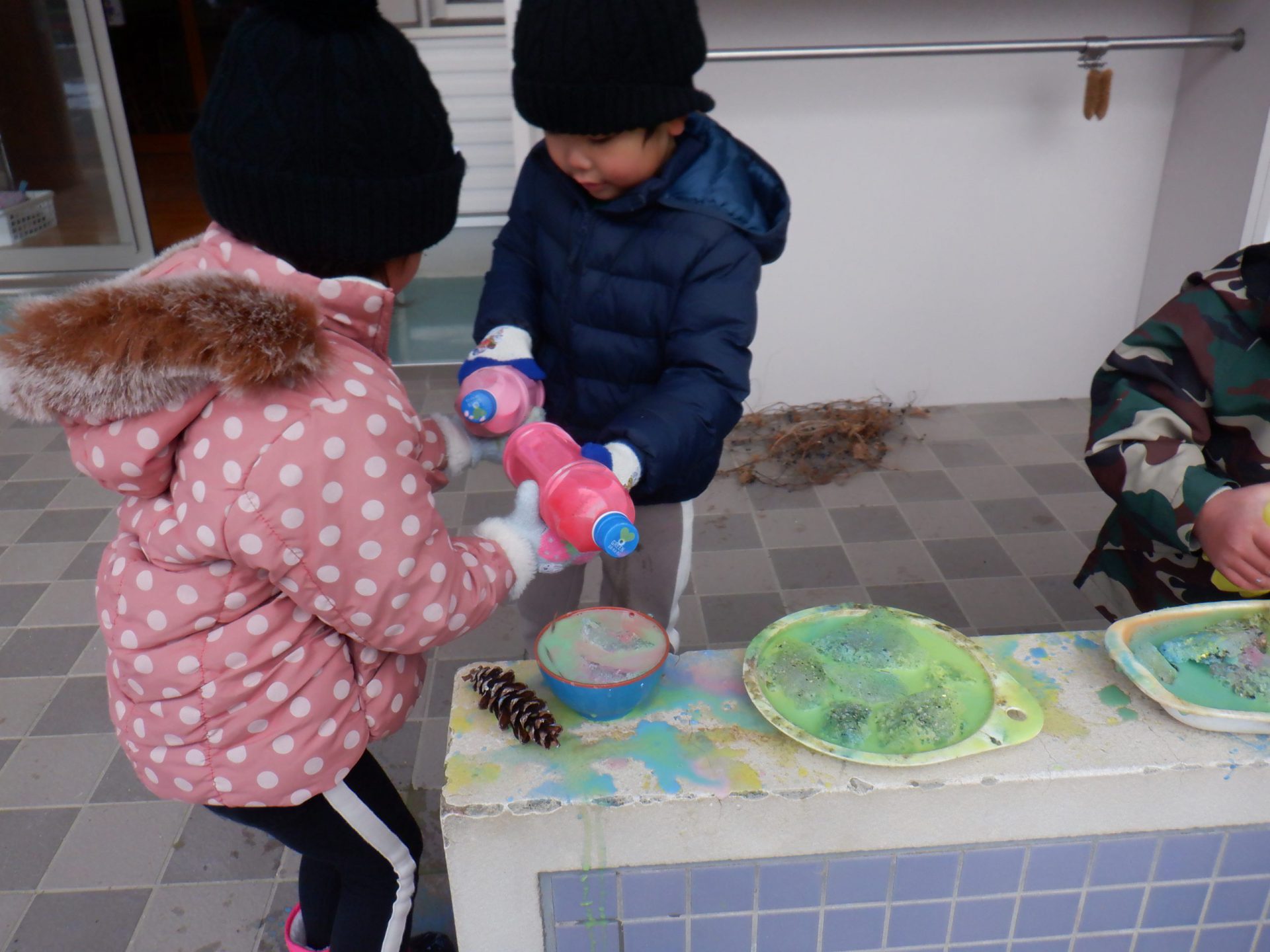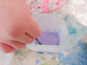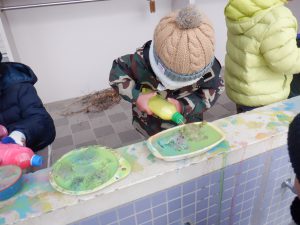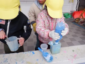 年中児は何色か色を入れ、かき混ぜて色の変化を楽しみます。