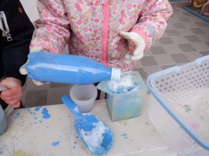 自分たちで白い雪を集めてきて作ったかき氷に色水シロップをかけて楽しみます。