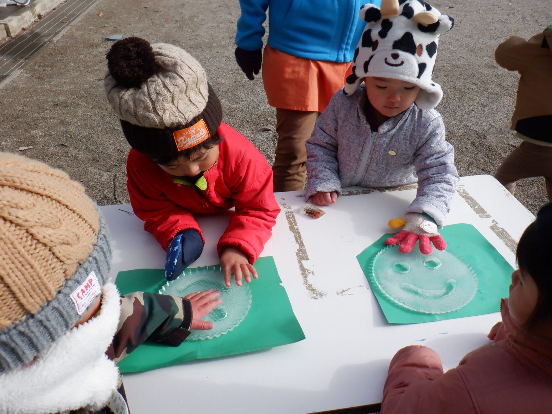 未満児は保育者が子どもたちと楽しみながら作った氷を触って、不思議さを楽しむ等お互いに良い刺激となっていました。遊んだ後『ゆきのけっしょう』の絵本を読むと子どもたちも興味津々。遊んだばかりの経験と重ね合わせ、楽しい言葉が沢山出てきました。