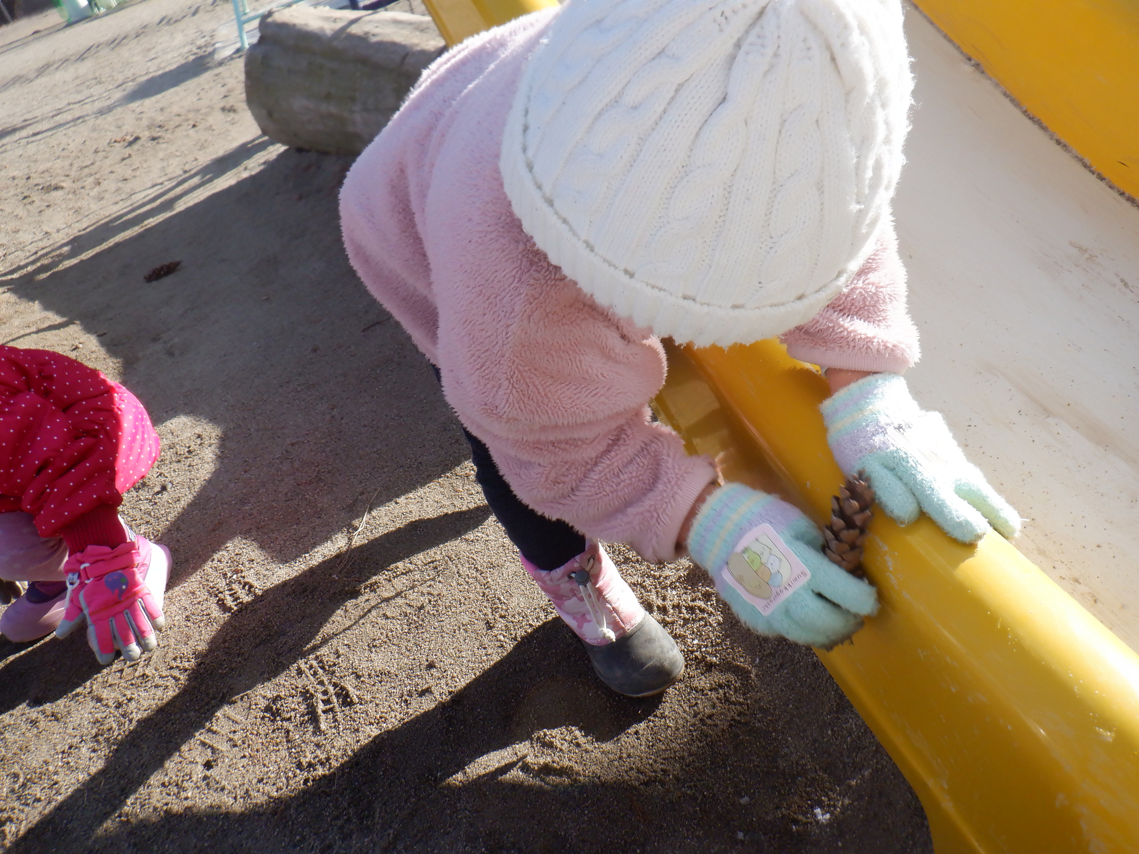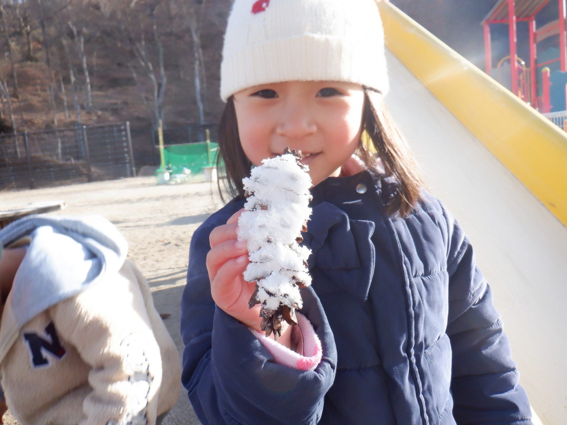 滑り台についた少しの霜を見つけ、松ぼっくりにつけて集めます。