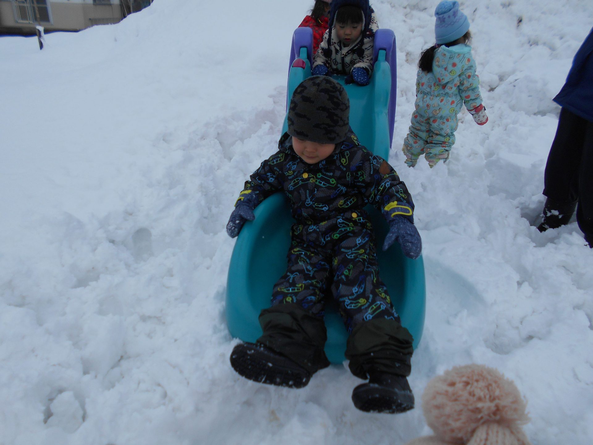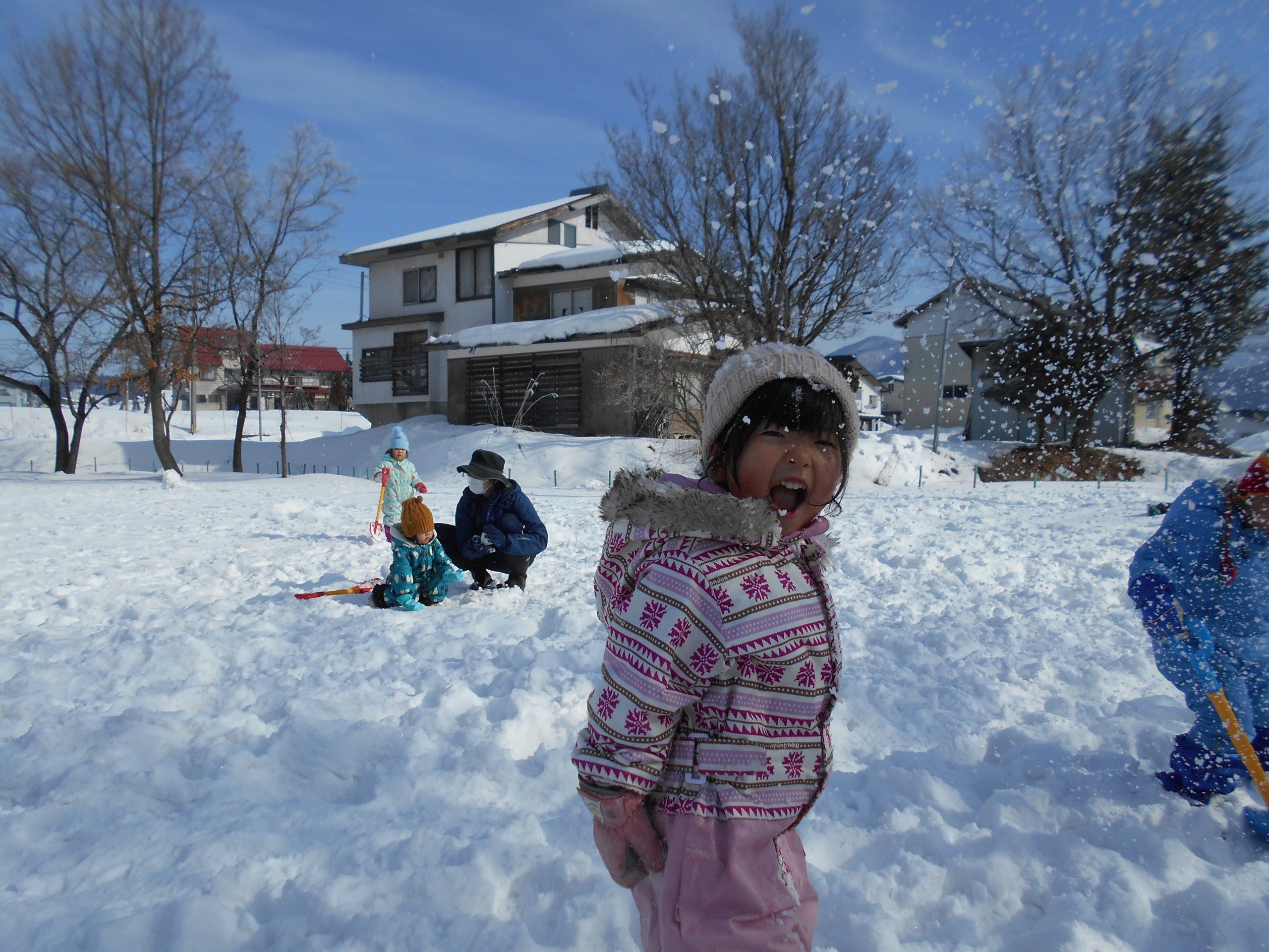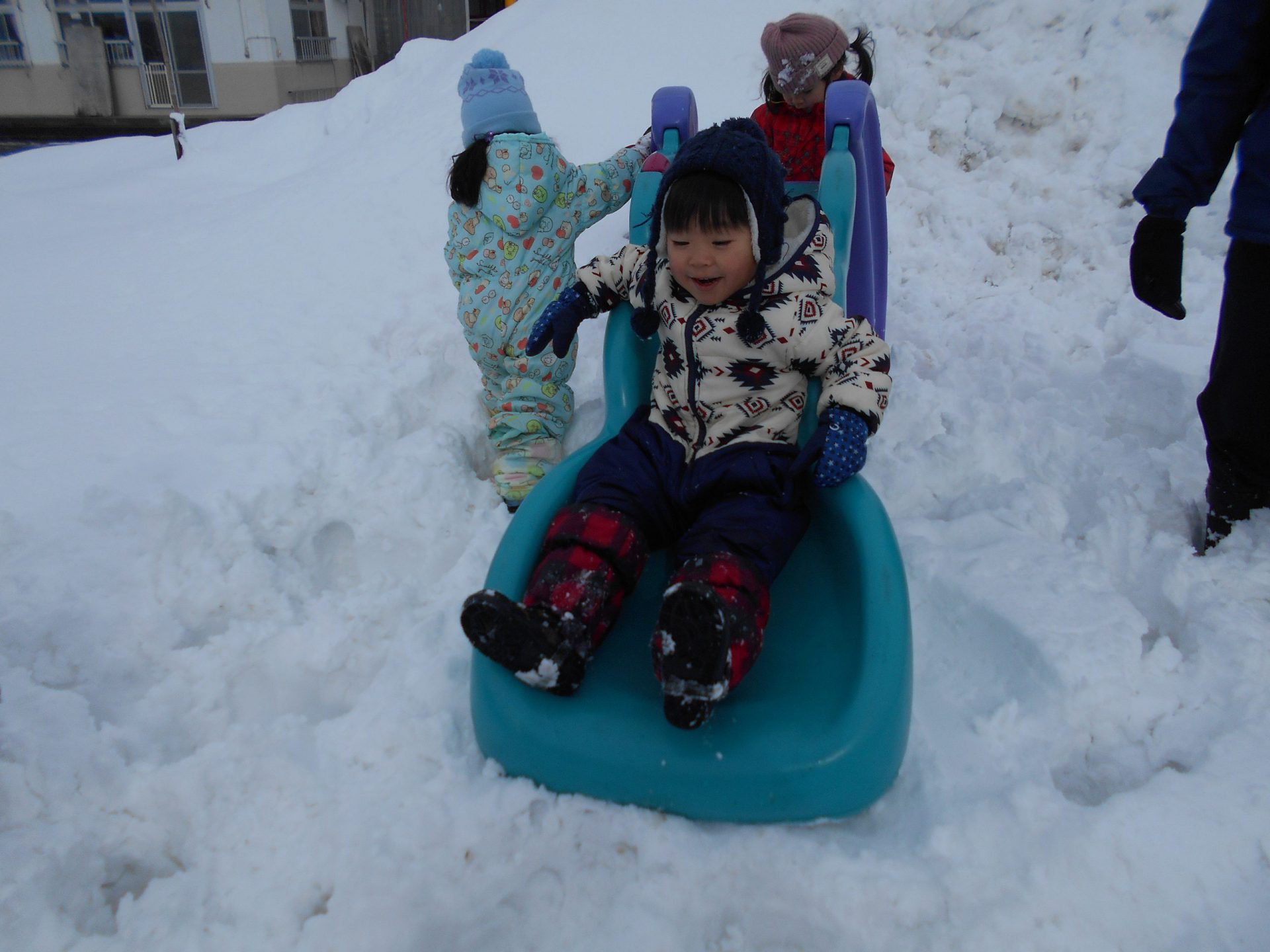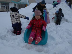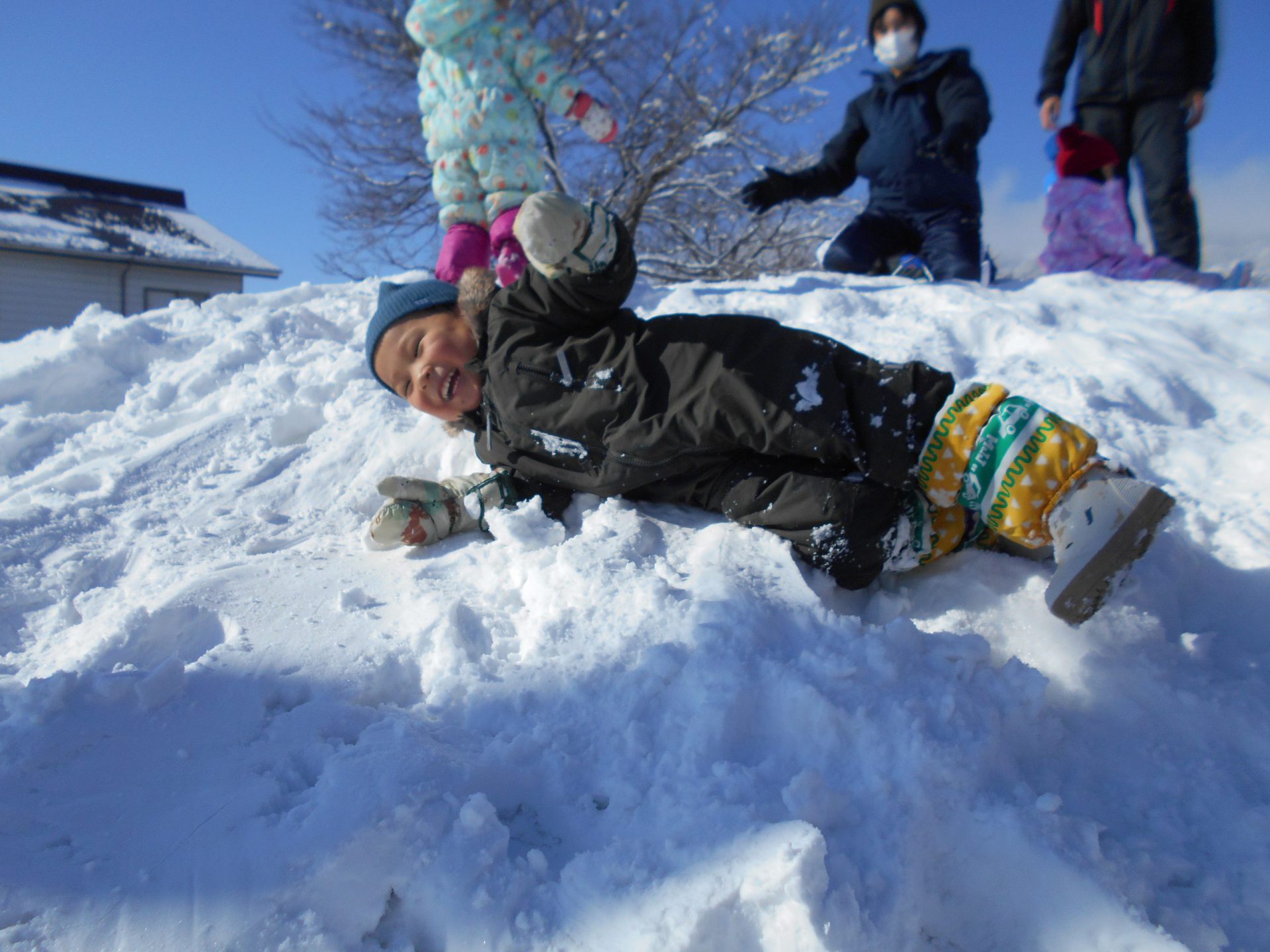 園庭に積もった雪・雪・雪・・・木の枝から雪が降ってきたり、除雪車のおじさんが作ってくれた雪山でいっぱいあそぶぞ〜!!