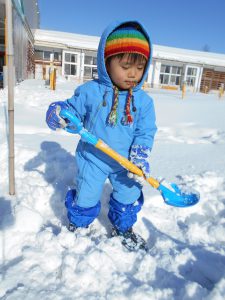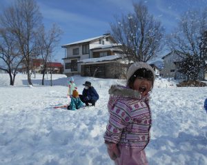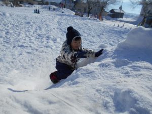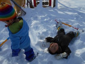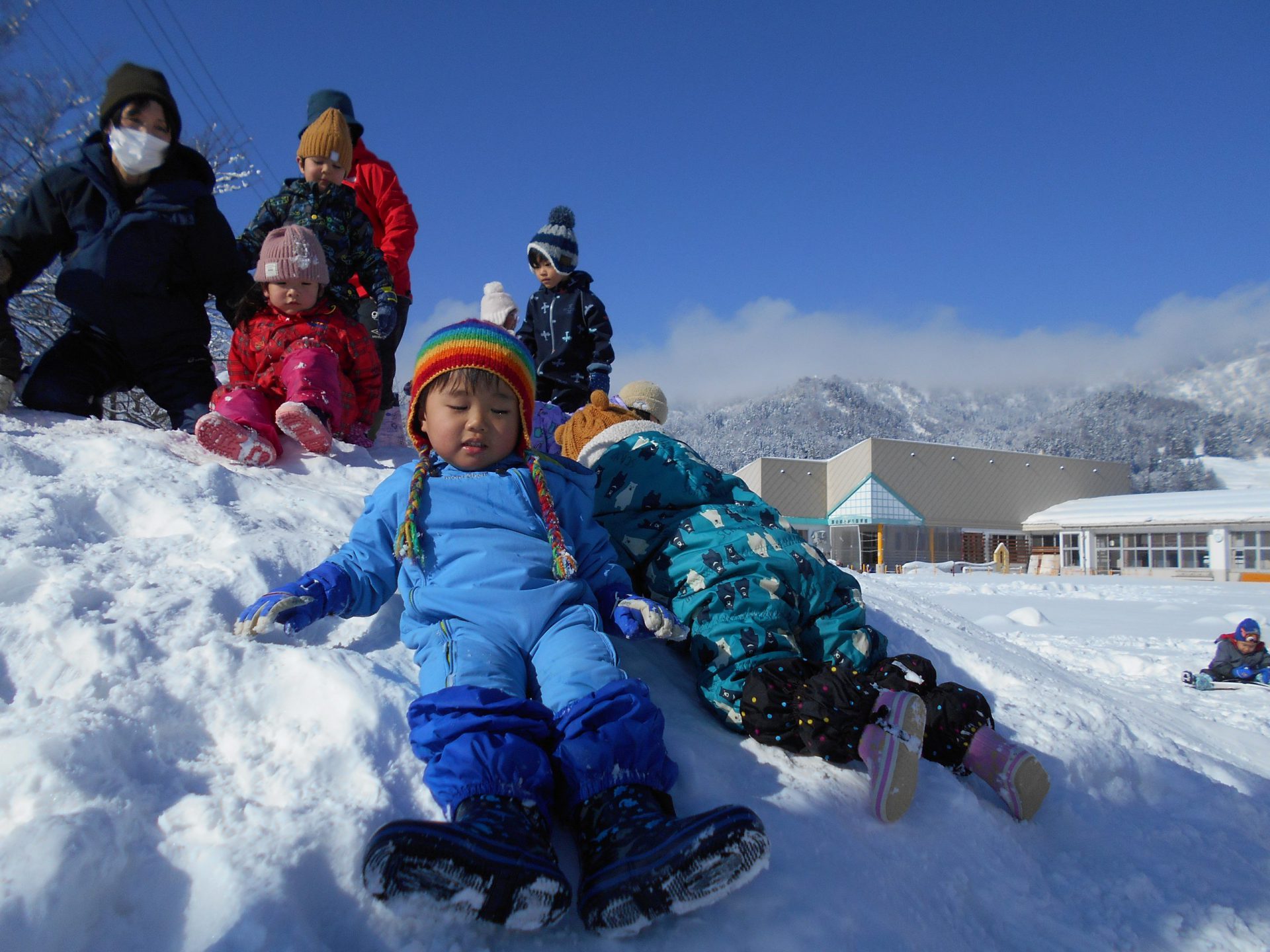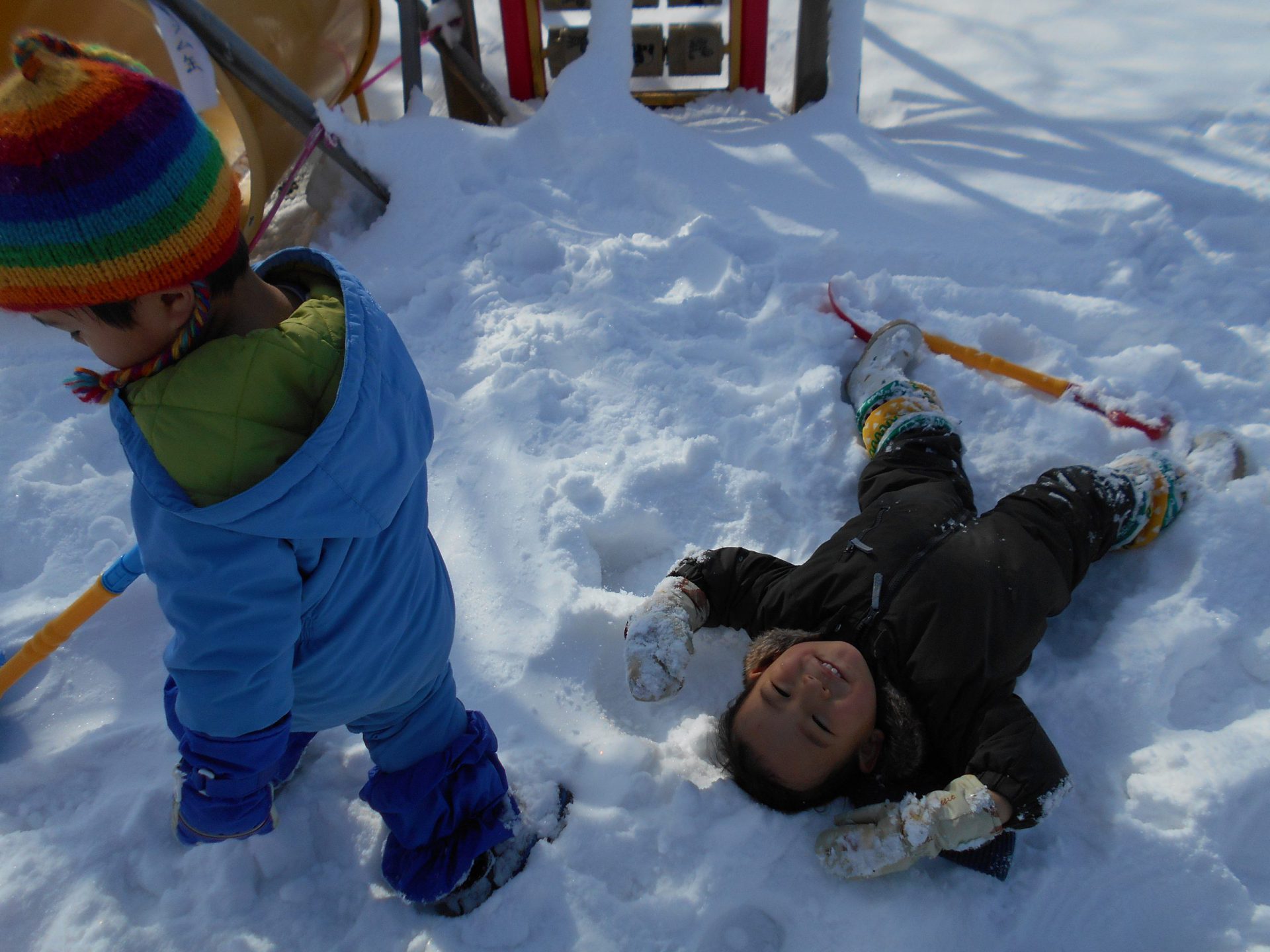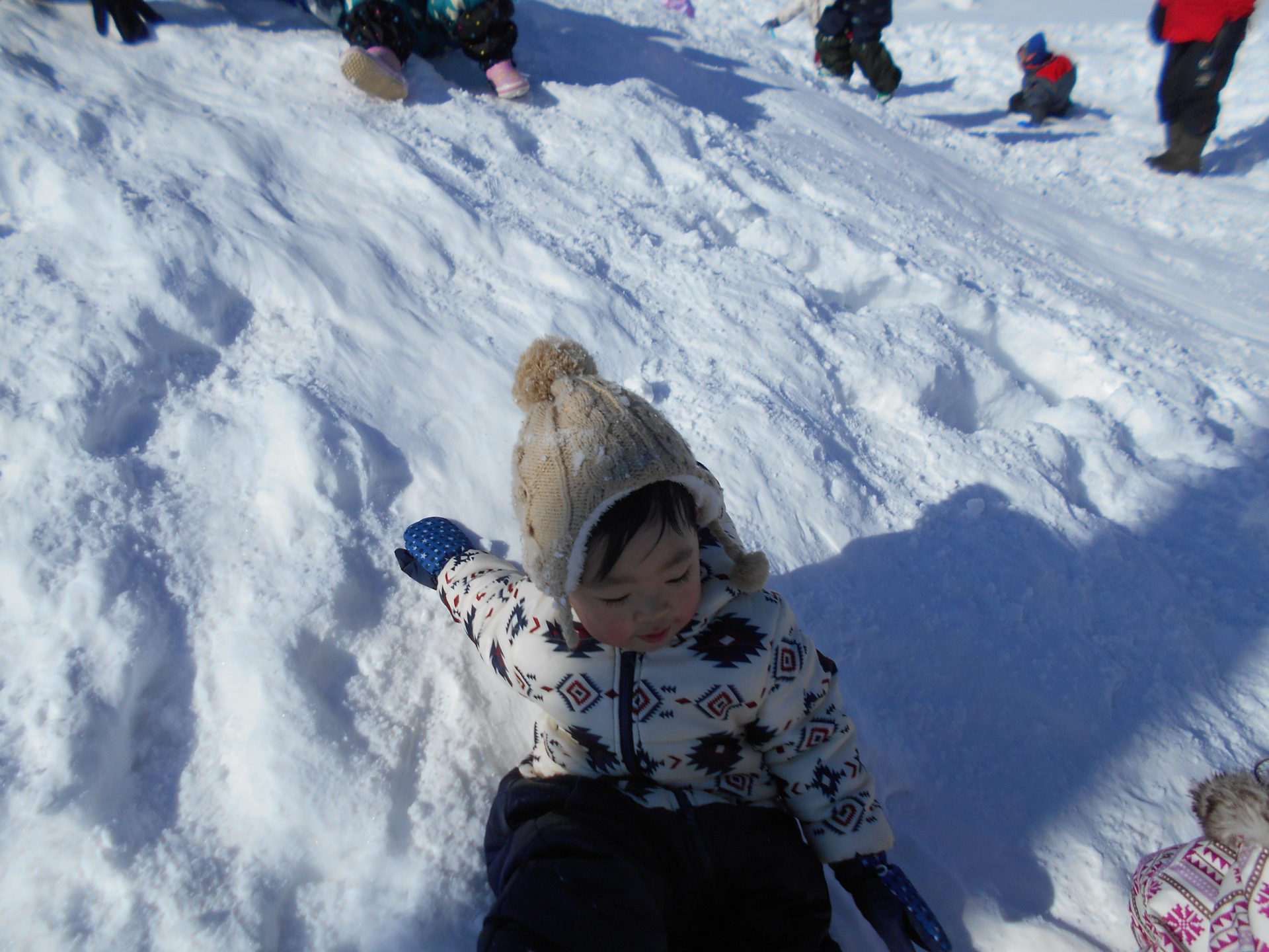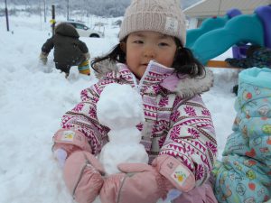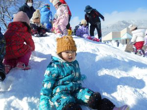 園庭に積もった雪・雪・雪・・・木の枝から雪が降ってきたり、除雪車のおじさんが作ってくれた雪山でいっぱいあそぶぞ〜!!