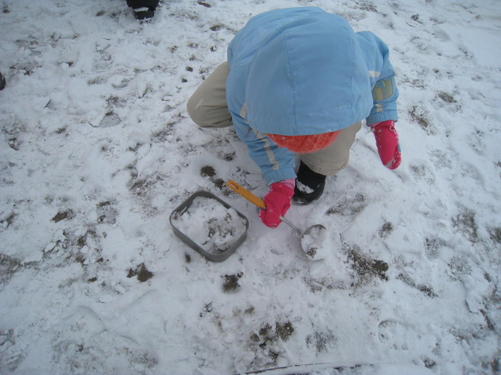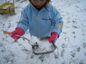 「ここにも、まだ雪がある!」と一生懸命、シャベルでかき集めます。