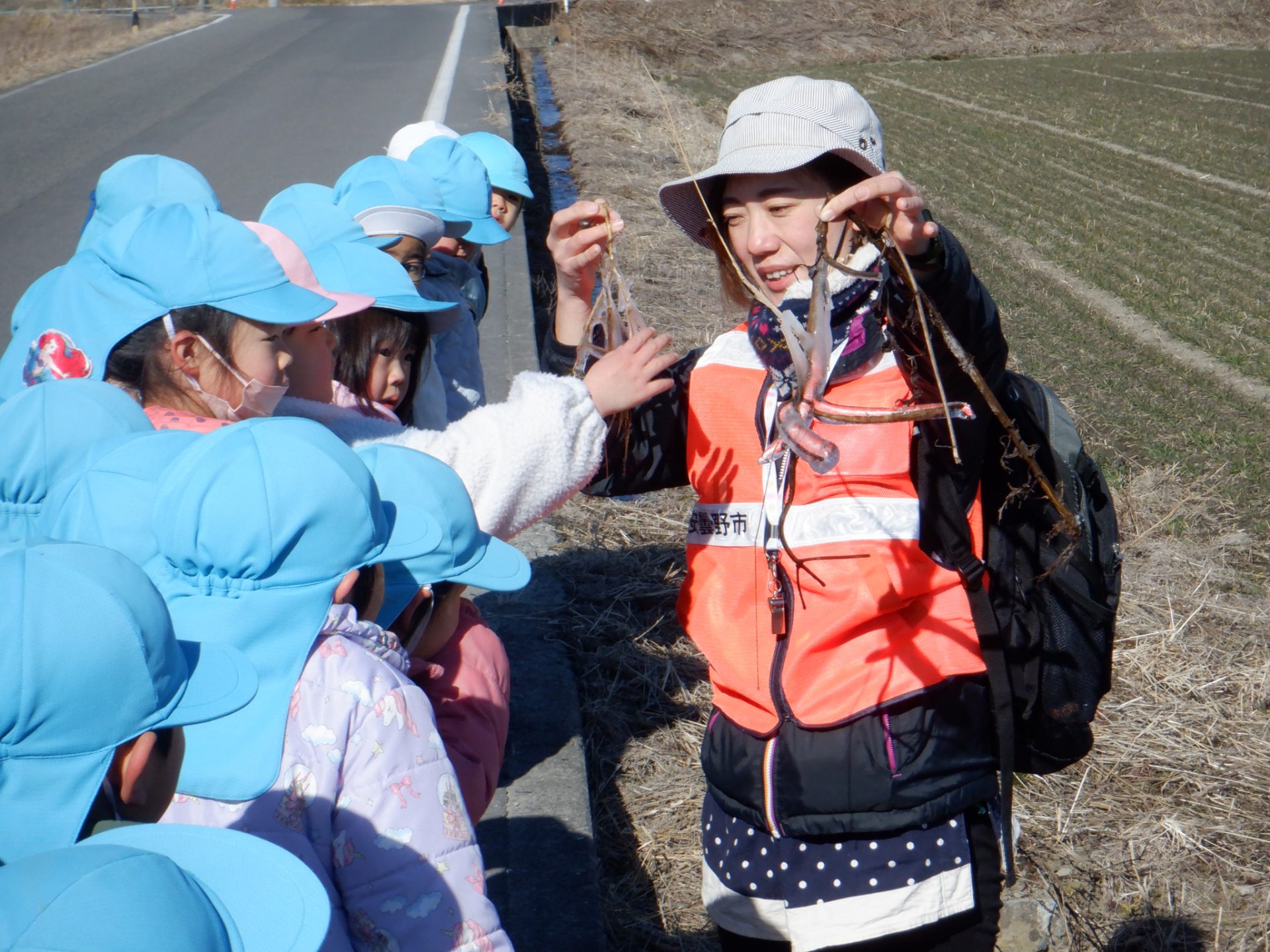 寒い冬ならではの自然に触れたり見たりして、身近な自然の変化に興味を持ってほしい。自然の中でできた氷の形の面白さを感じ、友達や保育士と一緒に共有できたことで、園に持ち帰って見せたいという気持ちが生まれたのかと思う。子どもたちと一緒に経験することを楽しみ、思いや気づきを感じ取れるように心がけていきたい。