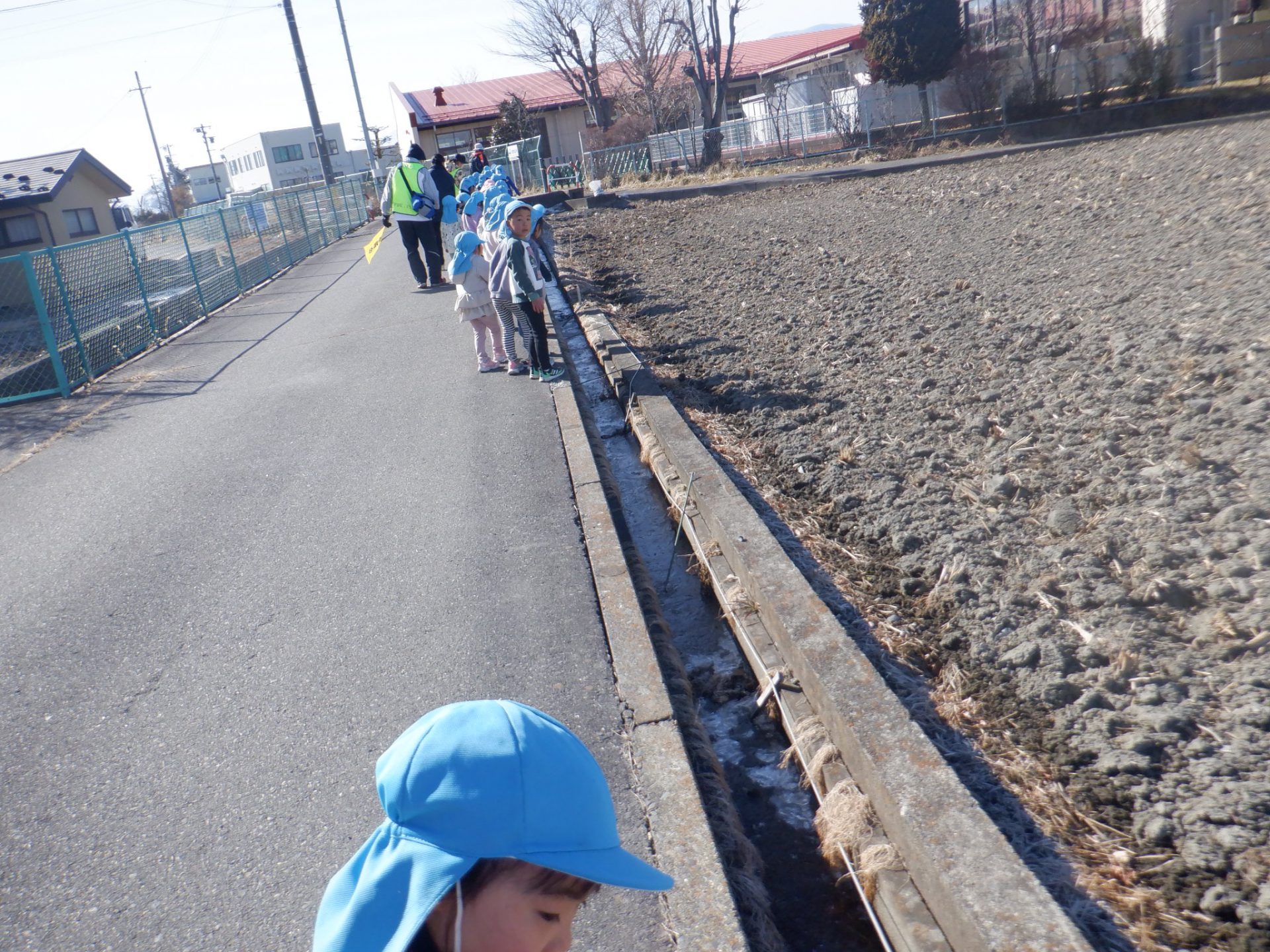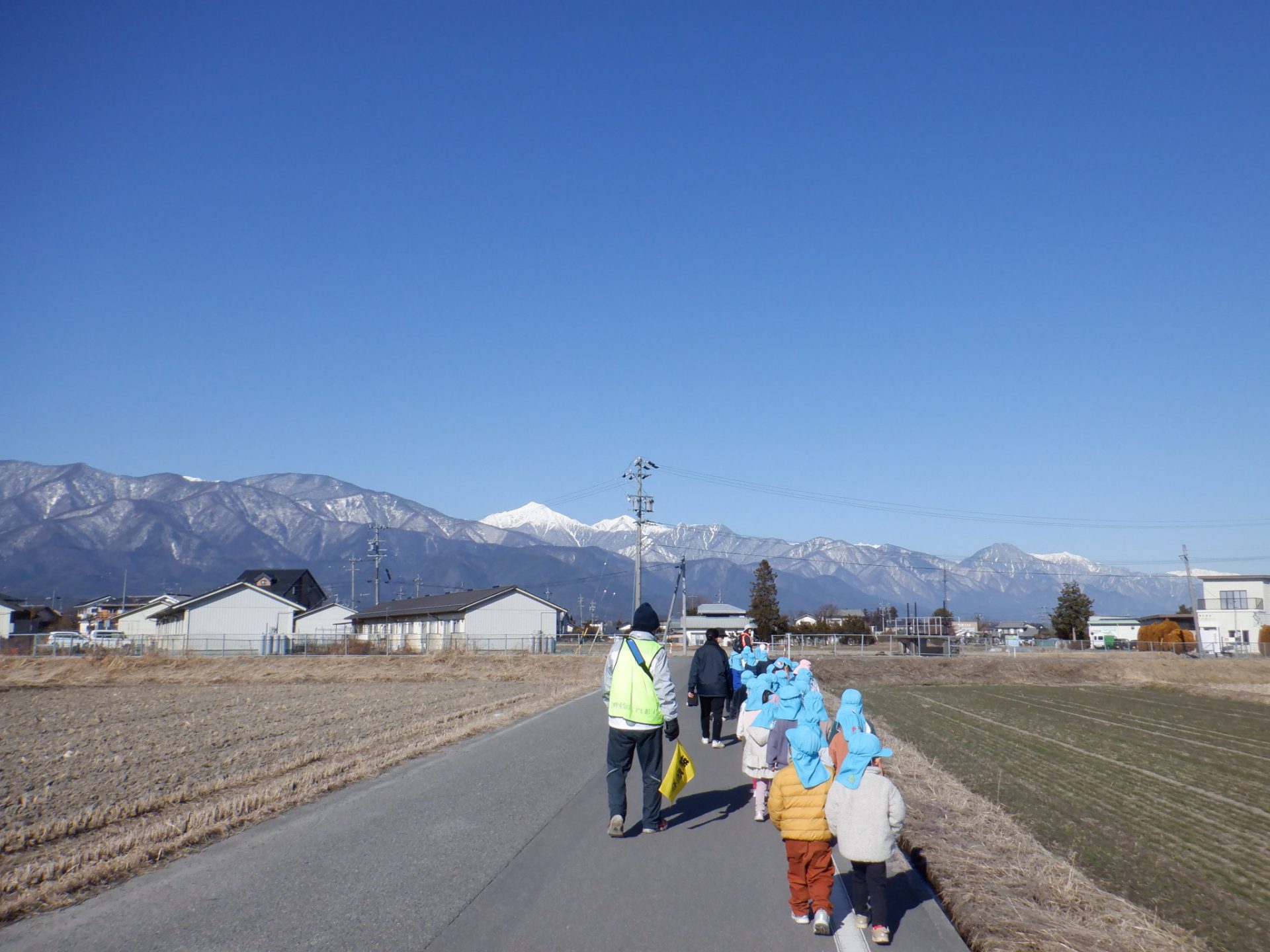 おじいちゃん先生が歩きながら「白く雪をかぶったお山は常念岳っていうんだぞ〜!あそこのお山のてっぺんまで安曇野市なんだよ。」と教えてくれました。
