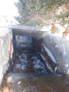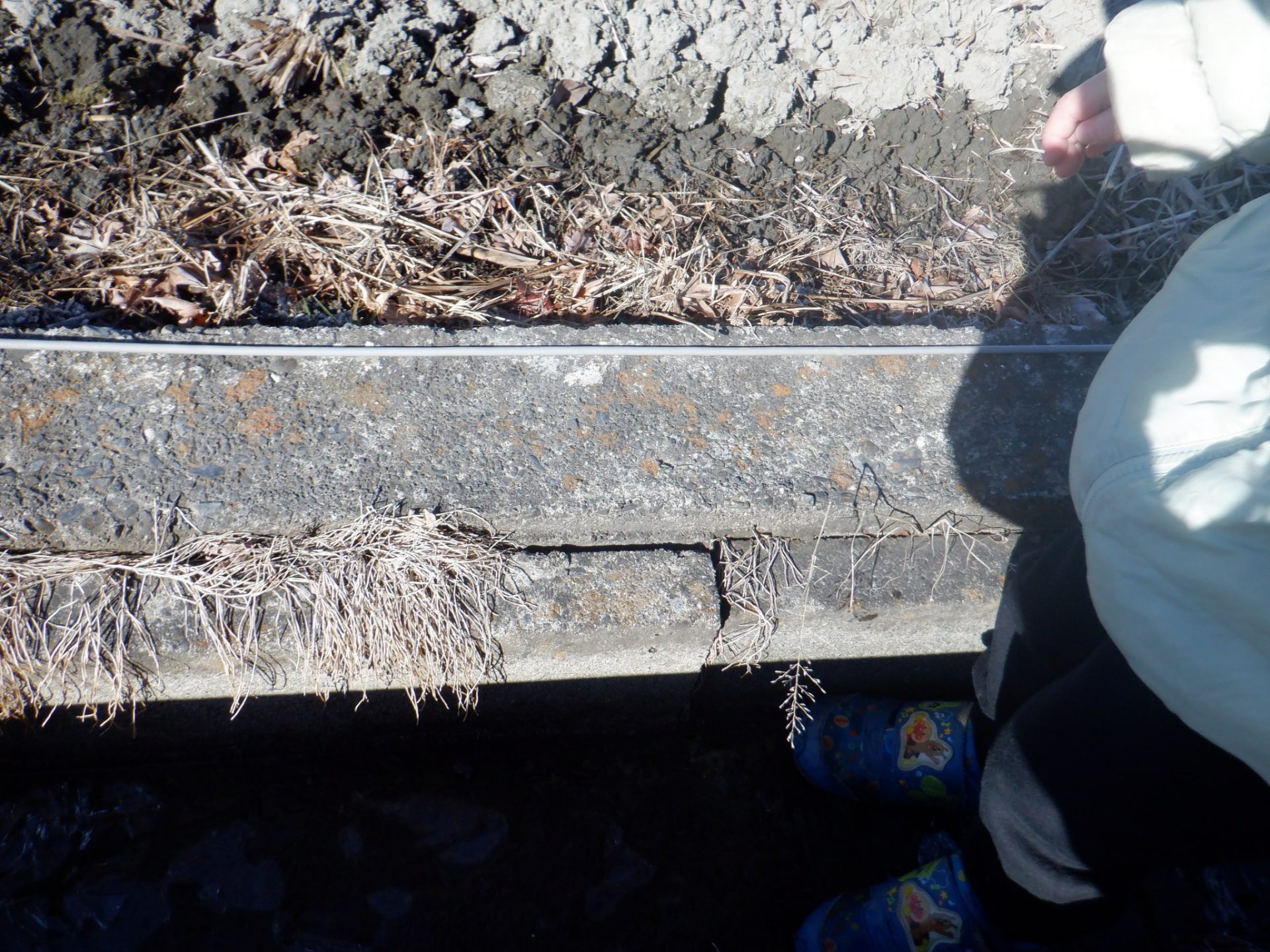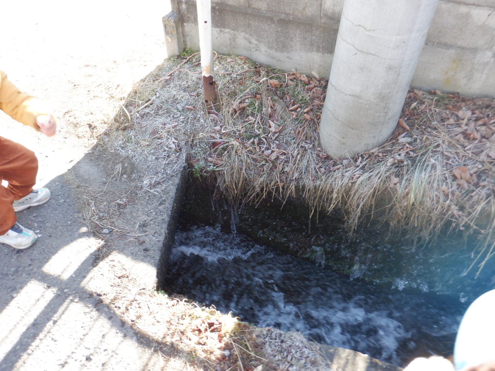 住宅街の水路に水が流れていて、氷を発見した子どもたち。