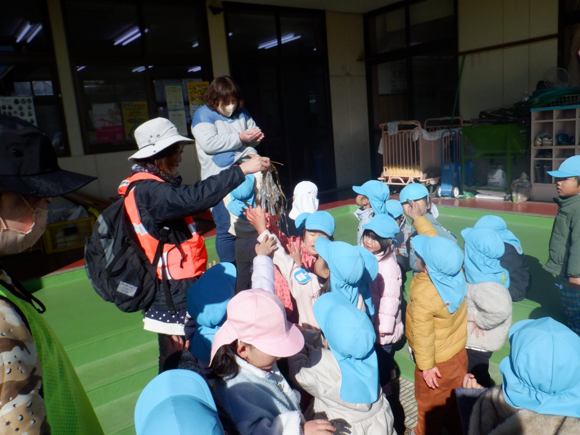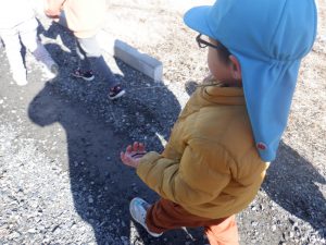 先生が見つけた大きな氷を見て触らせてもらうと、「つめたいね。」「つるつる〜!」「変な形!」とにこにこの子どもたちでした。