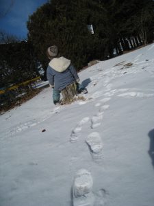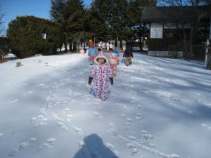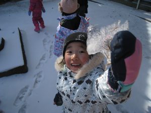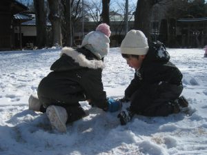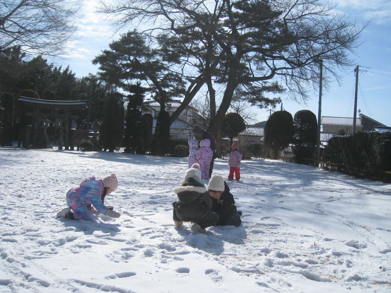 前日は園庭で雪遊びを楽しんだ東っ子たち!あっという間に雪はなくなってしまいました。そして、八幡神社様の境内には、なんと雪がまだ、踏み固められていないのを見つけた3歳児クラスの東っ子たちは、この日もまた、雪遊びを楽しみました。