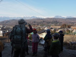 途中、「やまがきれい!」とSちゃん。「こういう形の山は常念岳、こっちの山はMちゃんが住んでいる所と同じ名前なんだよ」「ほたか?」「穂高だけど、穂高有明っていうでしょ。だから、有明山。『だけ(岳)』も『ざん(山)』も山っていう意味なんだよ」