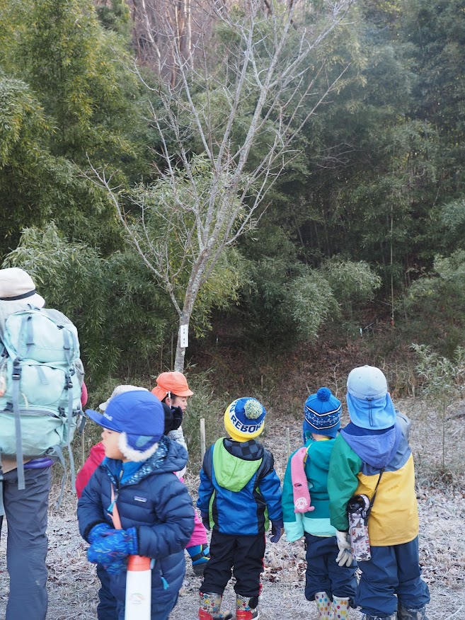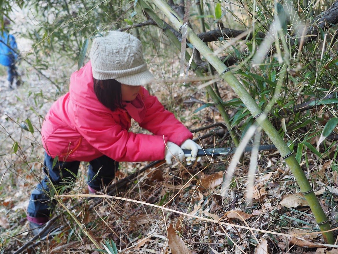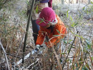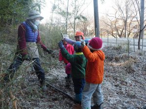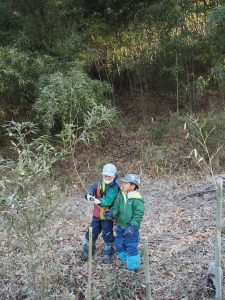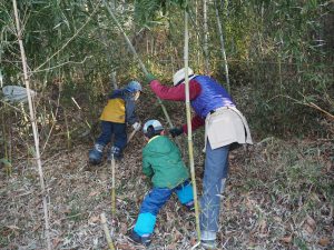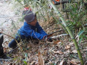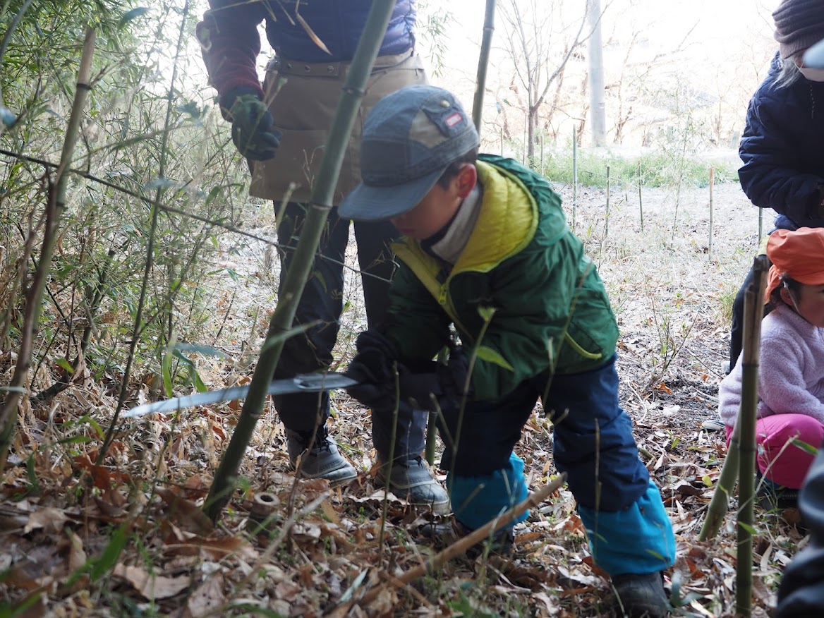 竹林に到着すると、年長児が竹を選び、切り出しました。「長過ぎず、短過ぎず、太過ぎず、細過ぎないのを選ぼう」と、「これはどう?」「いいね」と5本選びました。