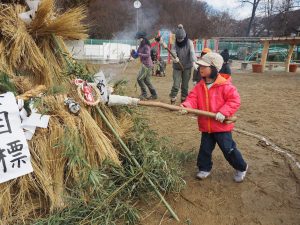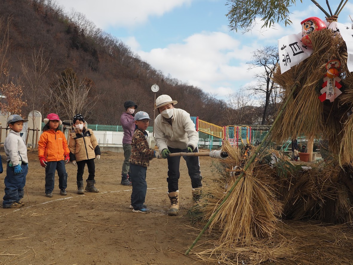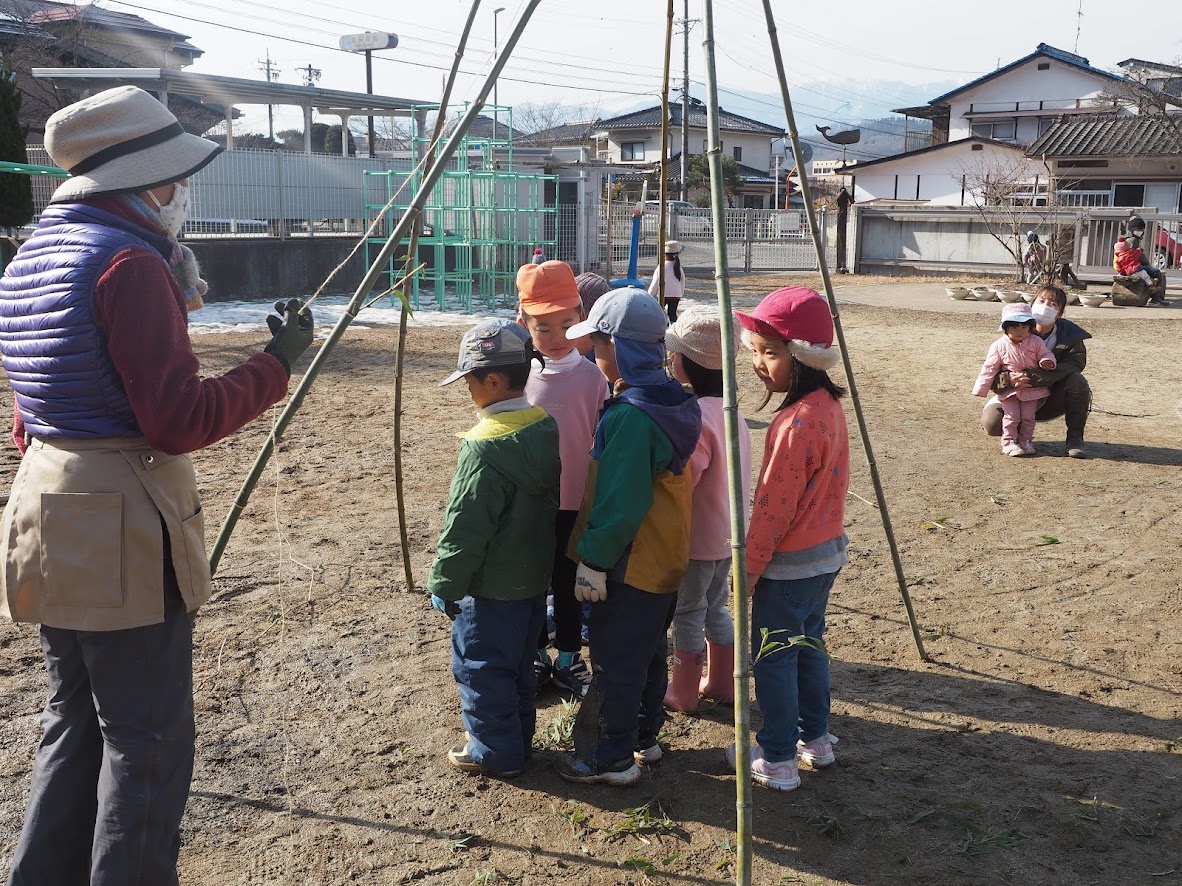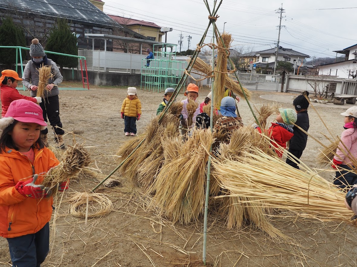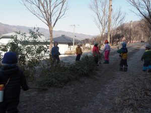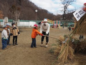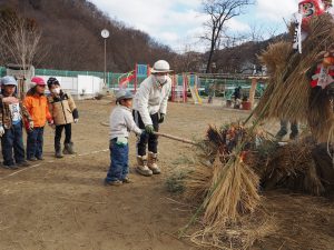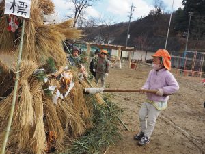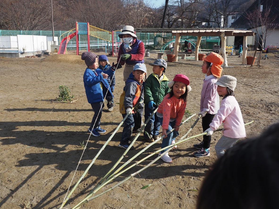三九郎が出来上がり、繭玉作りは竹串の制作から。刃物を上手に扱える年長児の仕事として年中児や年少児は尊敬のまなざしです。そのまなざしを年長児が受け取ってまた、大きくなりました。