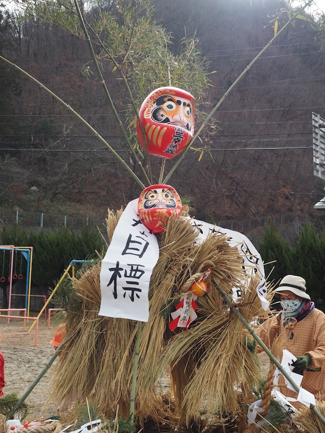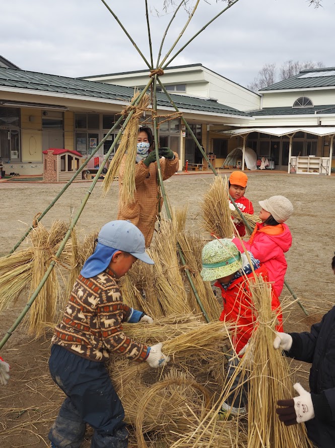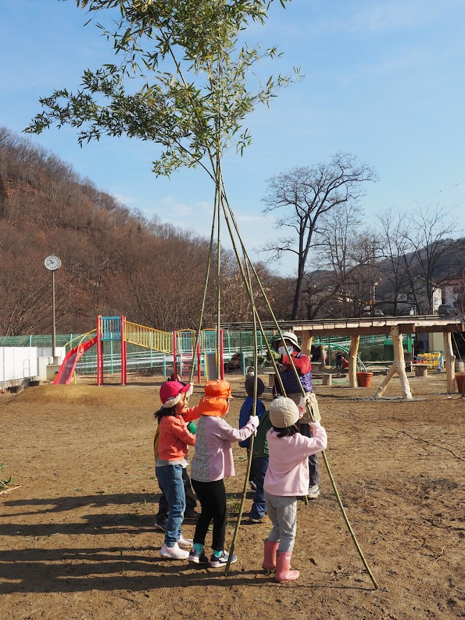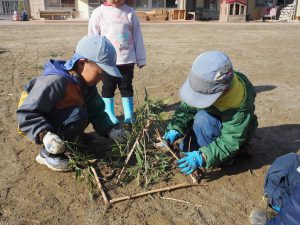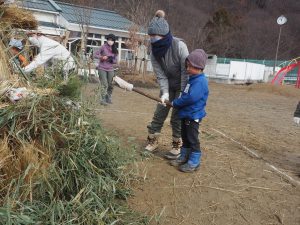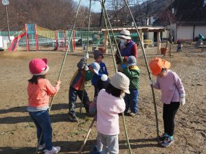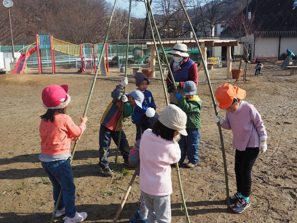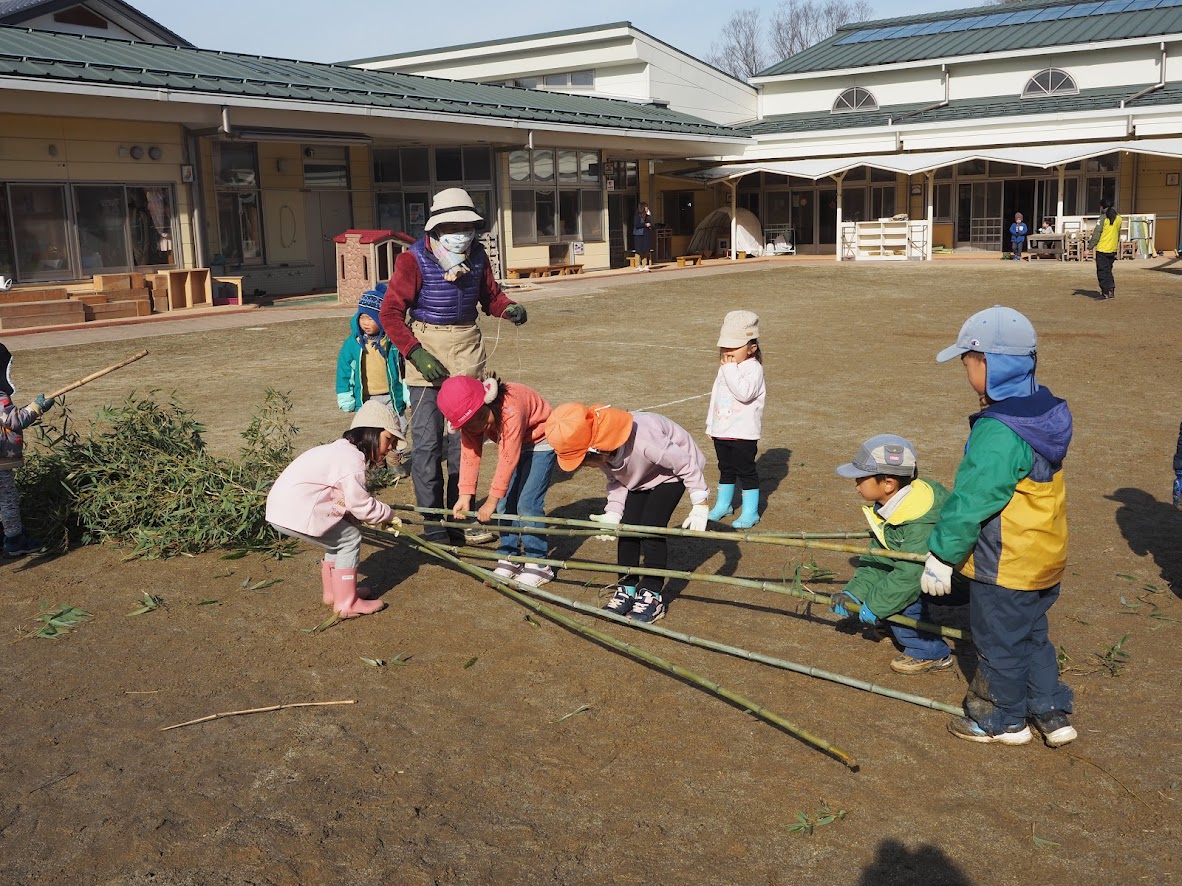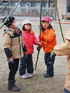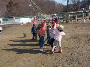 年長のしろながす組が中心になって、自分たちで竹を切り、運び、立て、藁や正月飾り、だるまを飾って三九郎を作り上げます。竹切り、竹運びや、骨組みの組み立て・・・みんなの力加減が三九郎の成功に結び付きます。