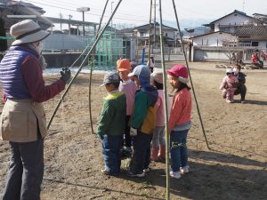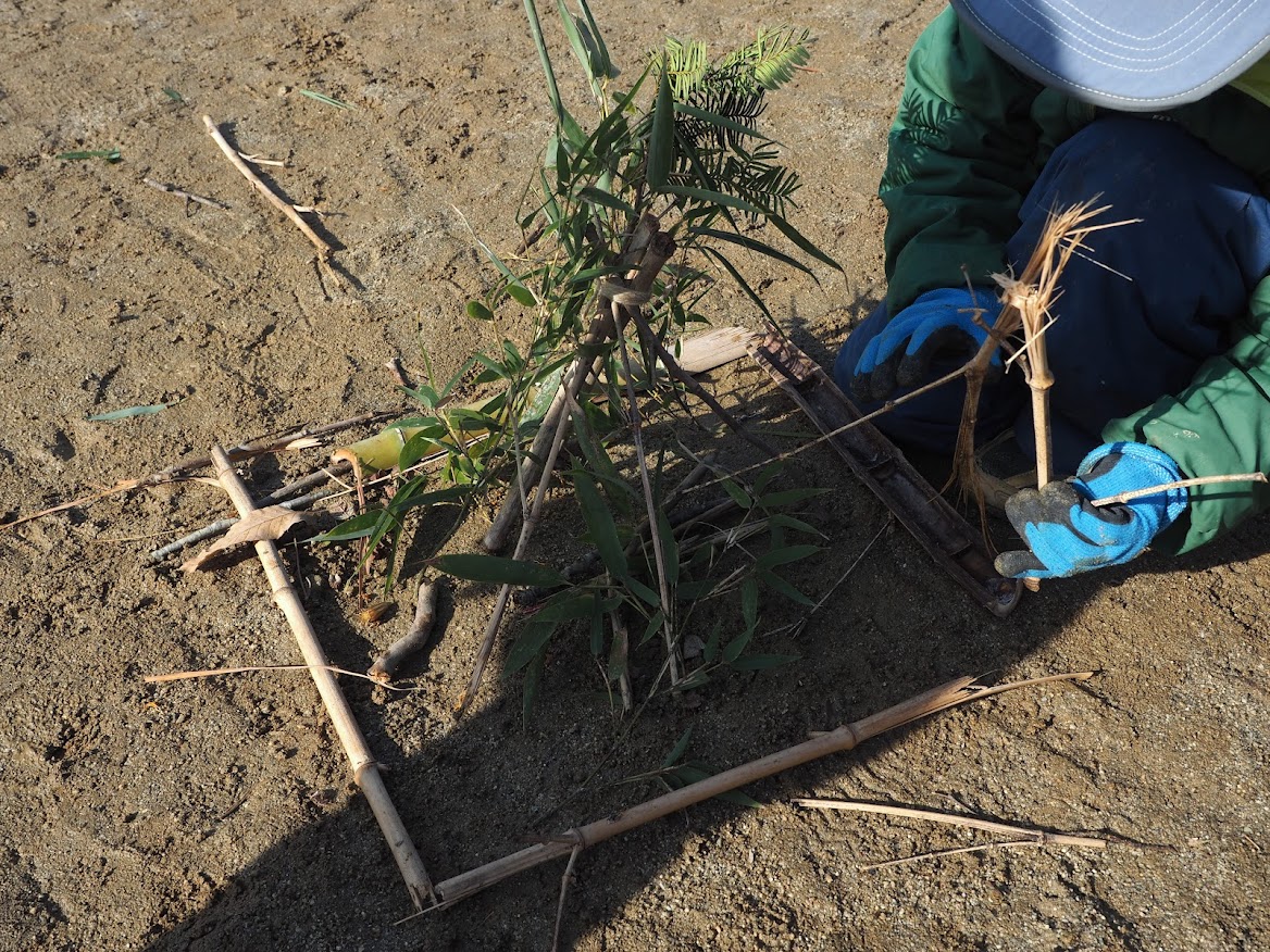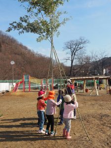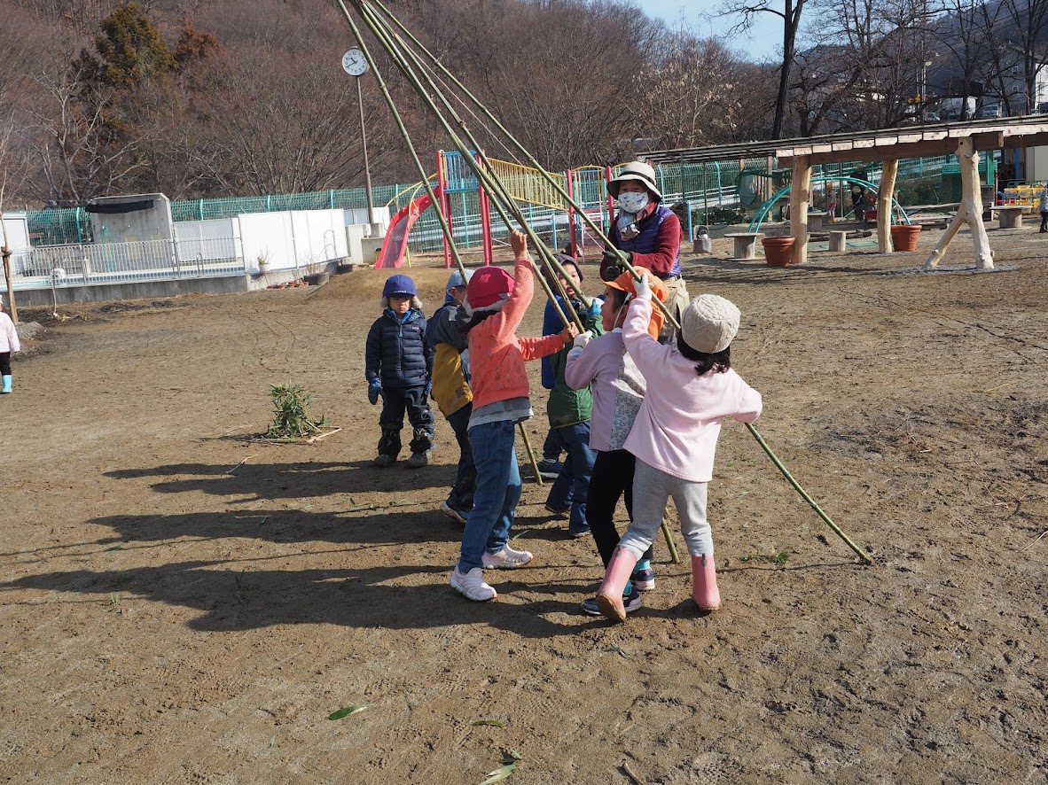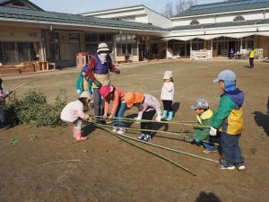 園に戻り、早速、枝を払い、先端を束ねてみんなで力を合わせて建てました。