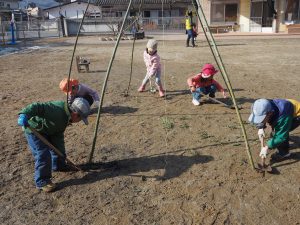 「風が吹いても倒れないように土で埋めとく」と、大急ぎでシャベルやスコップを持ってきました。