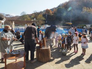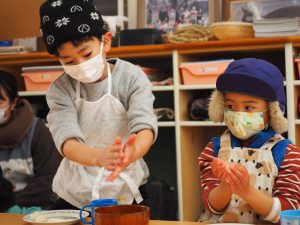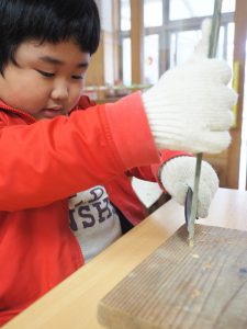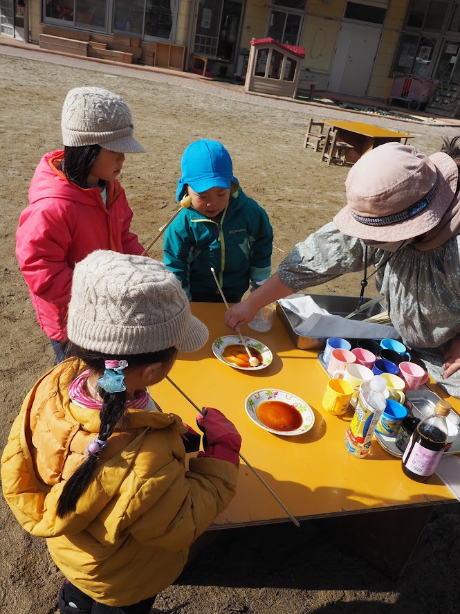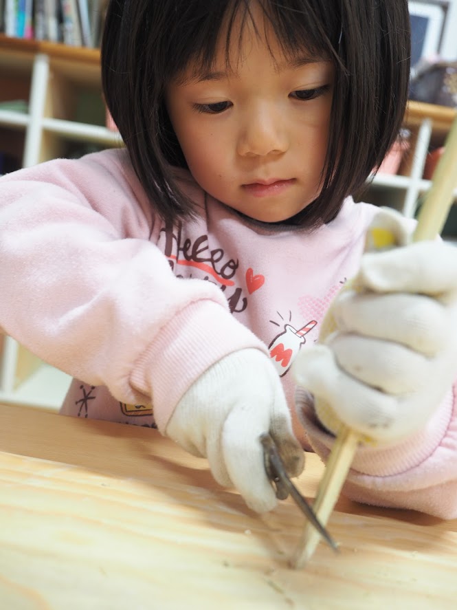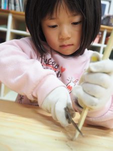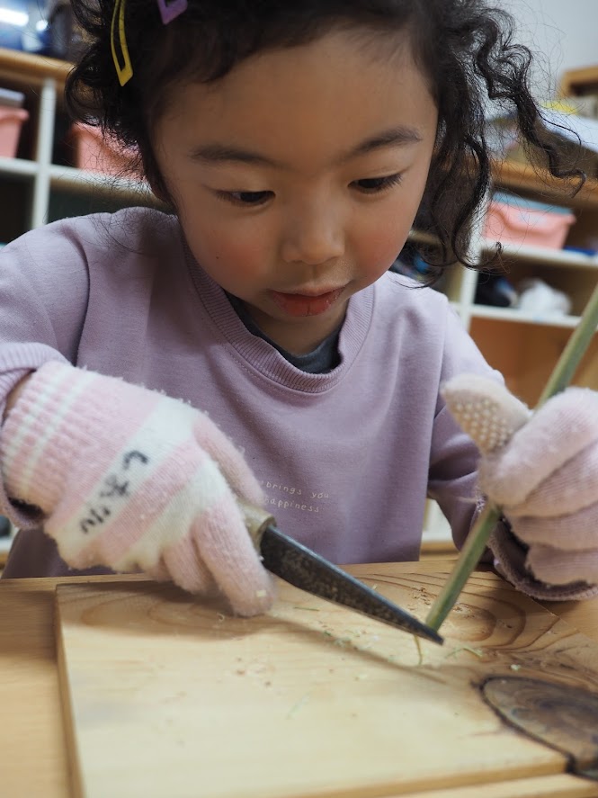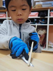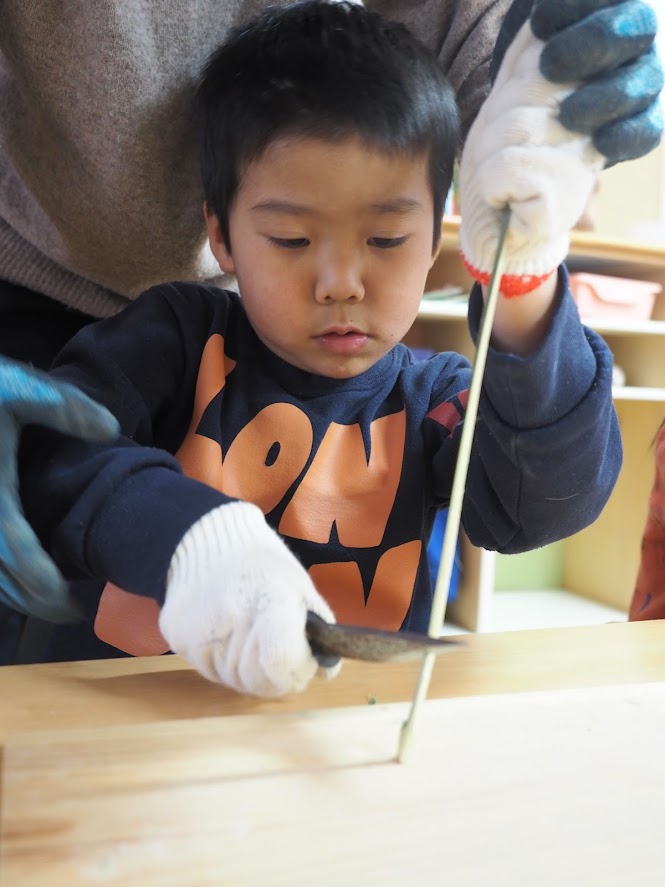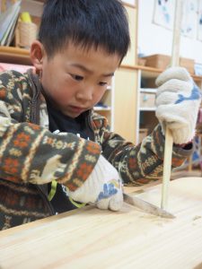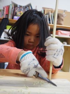 年長児は米粉で作る繭玉を焼く竹串作りに取り掛かりました。秋に、パジャマパーティーで竹をナイフで削ったので、慣れた手つきで、1人何本も削りました。やすりで仕上げもしました。